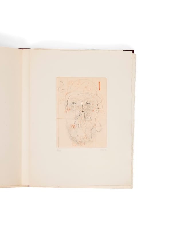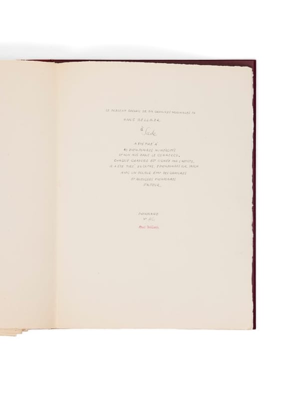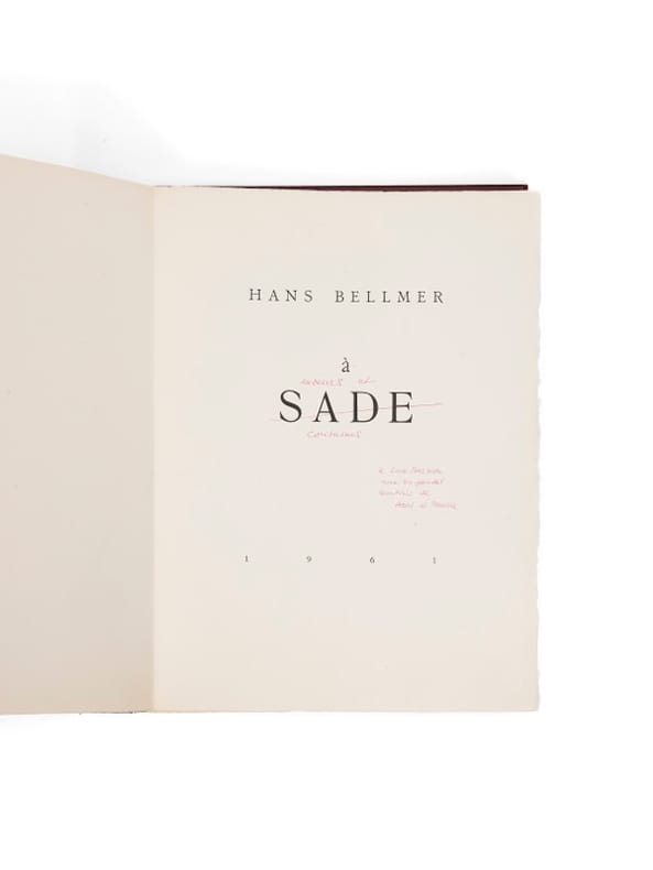 Depuis le début des années 30, Hans Bellmer s'intéresse à l'oeuvre de Sade : « j'ai l'intention de me consacrer intensément à l'oeuvre de Sade, en plusieurs projets d'illustration des 120 journées de Sodome et de La Philosophie dans le boudoir », qui resteront inachevés. Cependant, Bellmer réalisera des dessins qui lui serviront, ultérieurement, pour la réalisation de ses deux grandes suites rendant hommage à Sade : À Sade (1961) et Petit traité de morale (1968). Dans ces deux ouvrages, les épreuves résultent de la surimpression de deux cuivres gravés. Pour les exemplaires en couleurs, elles sont donc en deux teintes variables selon chaque planche ; « chacun dans une couleur différente - combin[ant] les images par condensation au sens freudien du terme, créant ainsi des gravures totalement différentes malgré la répétition des cuivres » (Flahutez, op. cit.). Le tirage de À Sade est limité à 55 exemplaires en noir (dont 5 sur Japon), auxquelles s'ajoutent 20 suites d'auteur en deux couleurs, justifiées au crayon à la main, tirées à part sur vélin d'Arches. Luce Barbier est la fille de Charles-Henri Barbier, ami d'enfance nantais de Claude Cahun ; cette dernière et Suzanne Malherbe en feront leur légataire universel. Plusieurs oeuvres de Bellmer des collections du Centre Pompidou sont entrées en dation via Luce et Bettina Barbier, en 2001. Le feuillet de justification de cet exemplaire a été entièrement exceptionnellement composé et autographié par Bellmer. On connaît, pour ces exemplaires en couleurs, trois autres portant également le titre modifié. Ils ont en revanche une justification imprimée. Pierre Dourthe, Bellmer, pp. 224-238 ; Bibliothèque Filipacchi, Hans Bellmer, 16-17 ; Dutel 942 ; Eros invaincu 117 ; Collection Gérard Nordman, II, n° 76 ; Pierre Dourthe, Bellmer, le principe de perversion, Paris, 1999, n° 330 ; Hans Bellmer. Anatomie du désir, Paris, Centre Pompidou, 2006, n° 216, p. 21 ; Fabrice Flahutez, Hans Bellmer : l’anagramme et l’estampe au service d’un rêve surréaliste, 2003, n° 52, p. 79-94