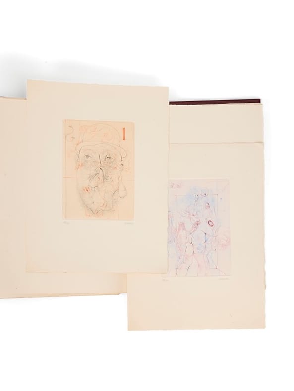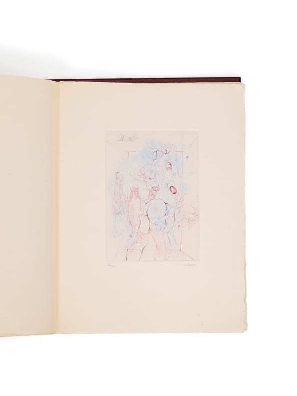 Premier tirage de la suite et envoi signé de Bellmer Étui passé. [Paris, Alain Mazo], 1961. 1 vol. (380 x 287 mm) de 10 gravures. En feuilles, sous chemise et étui de l'éditeur. Premier tirage de cette superbe suite de dix gravures libres au burin et à la pointe sèche, résultant de la surimpression de deux cuivres, et tirées en deux couleurs. Une des 20 rares suites en couleurs, toutes signées et justifiées par Bellmer. Chaque gravure, séparée par 2 feuillets blancs, est justifiée au crayon en chiffre romain et signée par Bellmer (exemplaire VIII/XX). Exemplaire personnalisé par Hans Bellmer, qui a biffé le titre À Sade et l'a remplacé par «Moeurs et coutumes» et y a ajouté un grand envoi signé : « pour Luce Barbier, avec les grandes amitiés de Hans et Unica ». Il comporte également à la place du feuillet de justification imprimé, une justification manuscrite de la main de l'artiste.