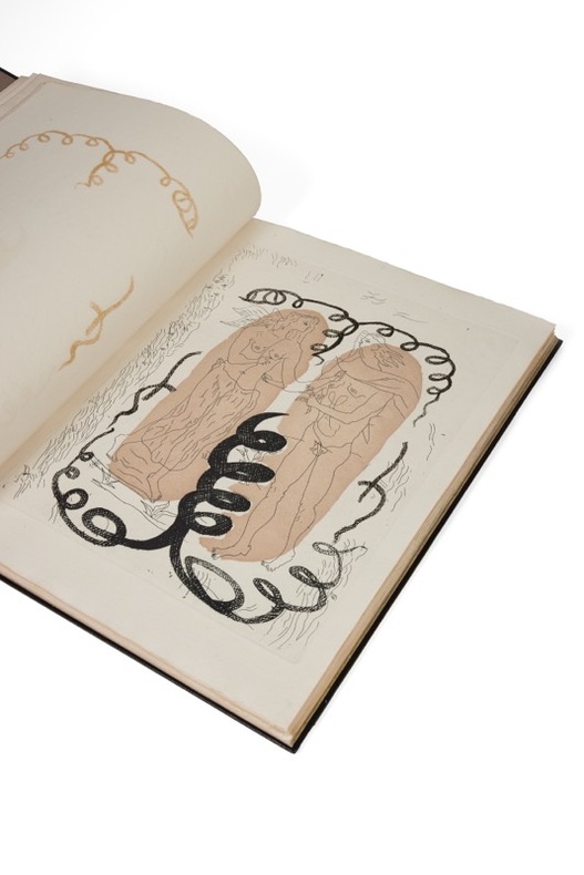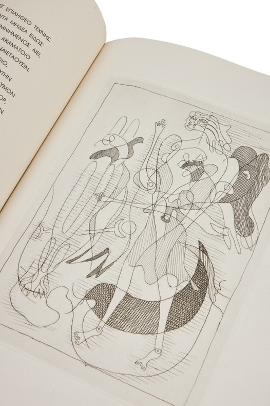 Ambroise Vollard et Georges Braque débutent la réalisation de ce grand livre (dans tous les sens du terme) en 1931, avec 16 eaux-fortes dans l’atelier Vollard, dont le décès l’année suivante stoppe l’impression et le projet. Aimé Maeght, vingt ans plus tard, en reprend l’édition avec Braque, qui réalise là ce qui est considéré depuis comme son plus beau livre illustré. Deux ans de travail seront nécessaires pour achever l’impression des 150 exemplaires sur Auvergne. À l’exception de la page de titre et de la justification, l’ensemble du texte est rédigé en grec. Chaque couverture a été vernie par Braque lui-même, avec une magnifique et particulière couleur ocre. François Chapon qualifie ainsi le travail de l’artiste : « La rigueur du métal ne fait qu’accentuer la grâce mouvante de la ligne. Du matériau mordu par l’acide, Braque tire les tailles croisées ou parallèles qui situent cet empire universel ». Roger Vieillard dans son ouvrage traitant des livres du peintre, l’a définie ainsi : « Une étonnante invention de formes se révèle dans la gravure. Le tracé d’eau-forte, souple mais rigoureux, définitif sans perdre les vertus vivantes de l’improvisation, construit un espace cohérent comme un bas-relief, tandis que la coloration de surfaces n’est pas moins présente que dans ses peintures. » Grande reliure de Renée Haas, qui réserva ses talents à quelques heureux collectionneurs, expliquant la rareté de ses reliures sur le marché. Ce fut le marchand Alexandre Loewy qui lui confia ses premières commandes, au début des années 1960 : des livres illustrés, parmi les plus importants, soit ceux de Picasso, Braque, Miro et Matisse (dont au moins quatre exemplaires de Jazz).