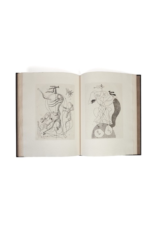 Paris, Maeght, 1955. Un volume in-folio en feuilles, couverture illustrée d'une gravure en couleurs à l'aquatinte et carborundum, vernie par l'artiste lui-même, étui-chemise éditeur décoré de collages de papiers de couleur. - 20 EAUX-FORTES ORIGINALES DE GEORGES BRAQUE : 16 gravures hors-texte exécutées en 1932 pour Ambroise Vollard, et 4 gravures réalisées en 1953 : la couverture en 5 couleurs vernie au pinceau par l'artiste, le frontispice en 2 couleurs, la tête de chapitre et le cul-de-lampe. - Tirage à 150 exemplaires numérotés sur Auvergne et signés par l'artiste. Celui-ci le n° 23 signé par Braque. Tirage unique - Conservé en parfait état. - Note historique : En 1931, Braque illustre la Théogonie du poète grec Hésiode (VIIe siècle av. J.-C) pour le marchand, éditeur et passionné de gravure, Ambroise Vollard. Le récit, consacré à la naissance de l’univers et à l’origine des dieux, est considéré comme l’un des grands textes de la mythologie grecque. Entre 1932 et 1935, l’artiste exécute une série de seize eaux-fortes qui seront publiées par Maeght en 1955 : ligne noire imprimée sur fond blanc pour les gravures et, en négatif, ligne blanche découpée sur fond noir pour les plâtres peints et gravés que Braque crée en parallèle. Comme les figures mythologiques et les natures mortes de l’époque, ces œuvres possèdent un style curvilinéaire et propice à la métamorphose. (The Artist and the Book 38). --- ENGLISH DESCRIPTION: GEORGES BRAQUE (1882-1963). THEOGONIA - the complete set of twenty (20) etchings, title paper, text in Greek by Hesiod, justification, and index of plates on Auvergne paper, watermark Montval, 1932-1955, one of the 150 (n. 23), signed in pencil on the the justification, published by Maeght Editeur, Paris, 1955, in mint good condition, loose (as issued), with paper wrappers, within black paper-covered boards and slipcase, with collage design on front and back, title, artist's and author's name on spine. Overall: 18 x 13 7/8 in. (457 x 352 mm.) Condition : near mint, a beautiful copy with the editor decorated slipcase in near mint condition too.