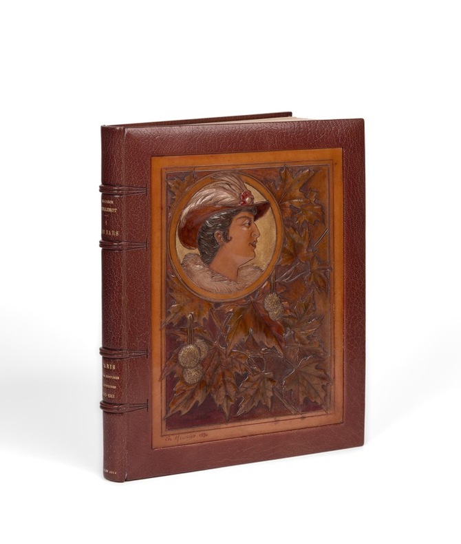 Précieux exemplaire dans une importante reliure de Charles Meunier Paris, La Maison du Livre, imprimé pour Charles Meunier, 1914. 1 vol. (300 x 375 mm). Exemplaire entièrement monté sur onglets. Maroquin havane, dos à nerfs soulignés sur les mors, plats biseautés avec, sur le premier, un important motif en cuir modelé et incisé, en relief peint et doré, représentant un visage d'élégante chapeautée dans un médaillon sur un fond de feuilles de platane, double filet doré sur les coupes, large encadrement intérieur orné de filets dorés et à froid avec motifs d'angle doré, tranches dorées sur brochure, couverture muette et couverture imprimée, chemise et étui (reliure signée de Charles Meunier). Édition de luxe tirée à 30 exemplaires seulement, sur Japon impérial (n° 6). Premier tirage de cette illustration, la plus réussie et la plus forte de cet artiste, comportant vingt eaux-fortes originales dont dix en couleurs, hors-texte.
