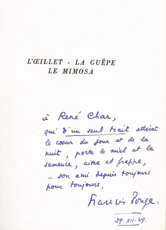 Envoi signé à René Char Lausanne, Mermod, coll. du Bouquet, (15 avril) 1946. 1 vol. (125 x 170 mm) de 71 p. et [1] f. Broché. Édition originale. Tirage unique à 1200 exemplaires numérotés (n° 739). Envoi signé : « à René Char, qui d'un seul trait atteint le cœur du jour et de la nuit, porte le miel et la semence, aime et frappe, - son ami depuis toujours pour toujours, Francis Ponge, 29.XII.49. ». La Guêpe avait déjà été publié, l'année précédente, à tout petit nombre.