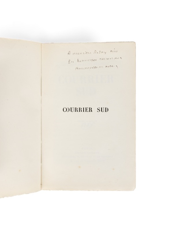 C'est en 1925 que Saint-Exupéry rencontre, dans le salon parisien de sa cousine Yvonne de Lestrange, la fine fleur des Éditions Gallimard : Gaston Gallimard, André Gide et Jean Schlumberger. Ces rencontres vont jouer un rôle fondamental dans l'entrée en littérature de Saint-Exupéry. Avant de tenter l'aventure de l'Aéropostale en Amérique du Sud, Saint-Exupéry fut envoyé à l'école de navigation aérienne de Brest pour un cours de perfectionnement. À cette adresse lui parvinrent les premières épreuves de son livre, dont il lut des passages à son cousin Honoré Estiennes d'Orves, son futur lecteur attitré. Il n'y apporta que d'infimes corrections et le bon à tirer fut signé aux premiers jours d'avril 1929. C'est une version très étoffée de la nouvelle L'Aviateur, publiée dans la revue le Navire d'argent en 1926. Publié grâce à André Gide, qui préfacera deux ans plus tard Vol de nuit, Courrier Sud est préfacé par André Beucler qui soutenait le premier l'idée que « Saint-Exupéry n'est pas un écrivain », idée reprise et développée par André Malraux : Saint-Exupéry n'est pas un écrivain en chambre et « il ne veut rien écrire que sa vie ne garantisse ou qu'il n'ait eu l'occasion de vérifier à ses dépens. C'est en quoi l'univers proprement littéraire lui demeure suspect pour autant qu'il trompe le lecteur en le transportant dans un monde facile et fallacieux. Saint-Exupéry reste l'un de ces hommes contraints à l'exactitude, pour qui l'imagination peut bien s'ajouter à la réalité, mais non pas en tenir lieu (...) ». Très bel exemplaire : il provient de la bibliothèque de Marcel de Merre (ex-libris et vente, Paris, Sotheby's, 2007, n° 436).