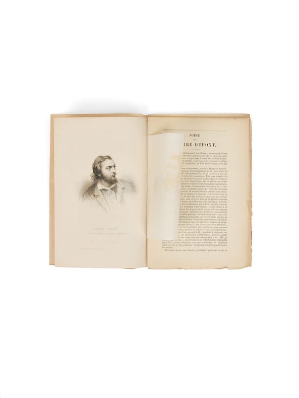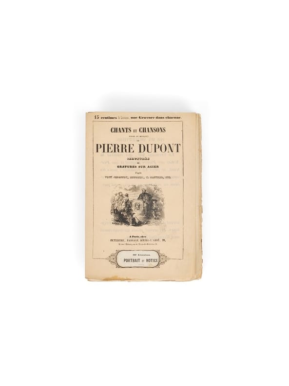 Préface rédigée par Baudelaire pour la vingtième livraison des Chants et chansons de Pierre Dupont, hymnes ouvriers et pastorales révolutionnaires de 1848. Baudelaire y célèbre «ce poète qui se met en communication permanente avec les hommes de son temps». Toutes les couvertures seront imprimées, quel que soit le tirage, chez Martinet, avec mention de ce dernier en quatrième de couverture. Elle portent toutes la gravure au médaillon dessinée par T. Johannot et gravée sur bois par Pisan, et la livraison diffusée chez divers libraires (Martinet, Dutertre, Lécrivain). Couverture bien complète de l'étiquette « 20e livraison. Portrait et Notice» collée dans le cartouche. Carteret I, 117 (en donnant l'adresse de Lécrivain) ; Clouzot, p. 43 (reprenant Carteret) ; Oberlé, Poulet-Malasis, 223 (adresse de Martinet et couverture rose) ; Vicaire, 516-518.