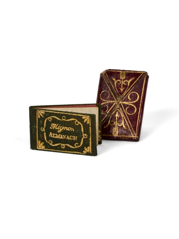 Charmant almanach miniature parisien. Vienne, Jos. Riedl, 1814. 1 vol. (28 x 18 mm) de [13] f. Maroquin vert, titre doré et orné, étui à glissière en cuir rouge orné. 8 gravures à pleine page.