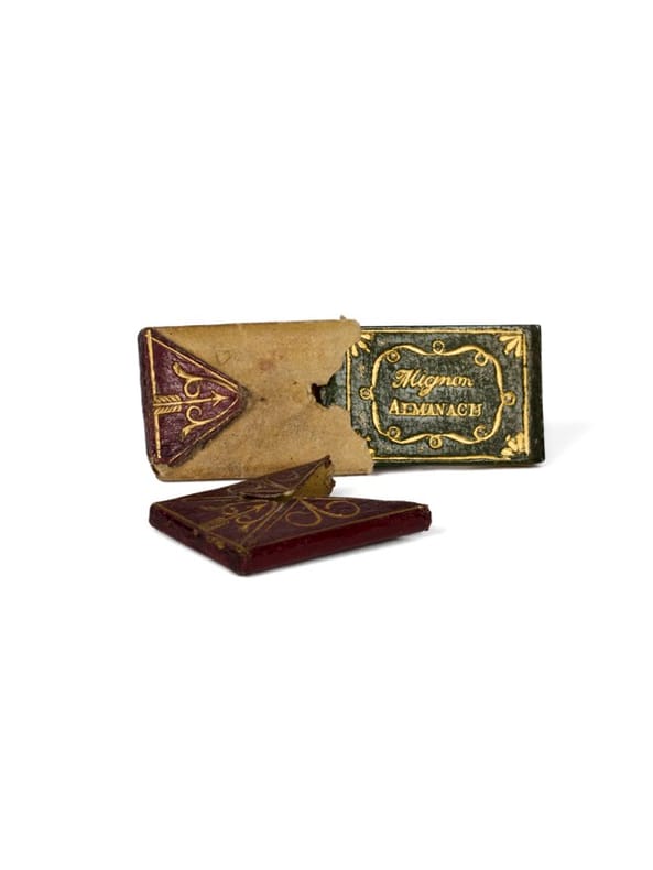 Suivant la mode londonienne, ces almanachs furent nombreux à être édités à Paris après la chute de l'Empire. Destinées à une clientèle féminine, ces petites impressions de poche - ou plutôt de salon - rivalisaient de minutie et de délicatesse pour séduire un public toujours plus exigeant. Mention manuscrite au feuillet blanc. De la bibliothèque Jean-Paul Kahn.