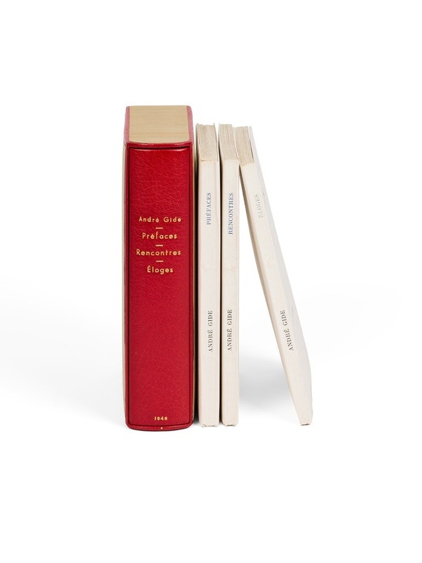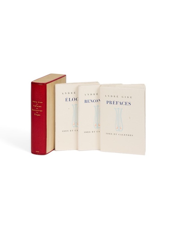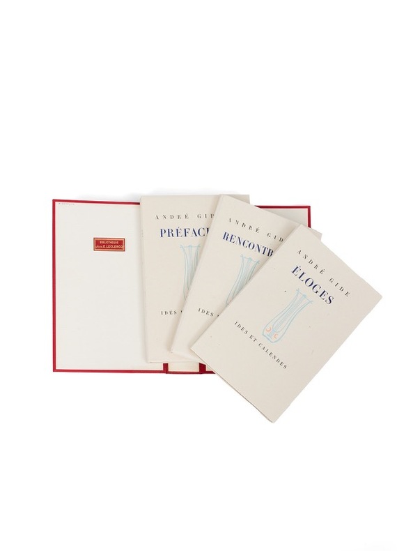 Réunion des trois titres publiés par André Gide chez ses amis de Neufchâtel, en Suisse, Jacqueline Heyd et Richard Heyd, directeur d'Ides et Calendes. Bibliophile, Richard Heyd est un grand admirateur de Gide, qui lui confia l'édition d'un premier texte en 1945, Jeunesse, puis d'autres inédits, comme ces Éloges et Rencontres. Ides et Calendes est l'éditeur de la monumentale publication de son Théâtre complet en huit volumes, et plus encore, à titre posthume, d'Et nunc manet in te (1951). Gide complétera les deux textes inédits précédents par le volume des Préfaces, rassemblement de celles qu'il rédigea tout au long de sa carrière : préface aux Fleurs du Mal, à Vol de nuit, Terre des hommes, à Lamiel, au Voyage en Orient... Parfait état des volumes. De la bibliothèque Jean-E. Leclercq (ex-libris).