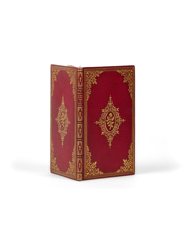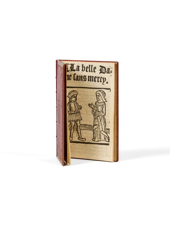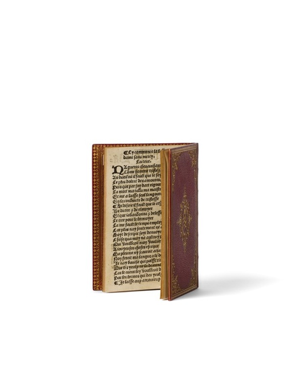 Seul exemplaire connu [Paris, J. Hubert, c. 1529]. 1 vol. (80 x 120 mm) de [32] p. [A-B8]. Maroquin rouge, triple filet d'encadrement sur les plats, écoinçons aux petits fers et médaillon central orné d'une rose, dos à nerfs orné, titre doré, filet sur les coupes, tranches dorées, dentelle intérieure (reliure signée de Bauzonnet-Trautz). L’une des pièces les plus emblématiques de l’amour courtois. Le terme de rareté proverbiale n’est ici pas usurpé : il s’agit ni plus ni moins du seul exemplaire connu de cette rare édition - autrefois propriété de la collection Fairfax-Murray. Ce délice d’exemplaire a été soigneusement établi au XIXe siècle par Bauzonnet. C'est également l'exemplaire le plus ancien en main privée : les sept autres exemplaires connus, imprimés entre 1488 et 1515, sont tous en collections publiques, en France, aux Etats-Unis et en Angleterre. On ne connaît qu'un seul autre exemplaire en collection privée, celui de l'édition de l'édition de 1530.