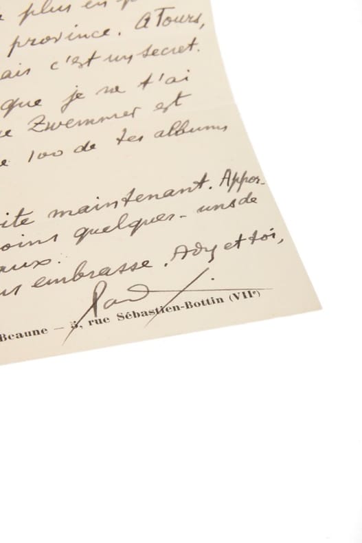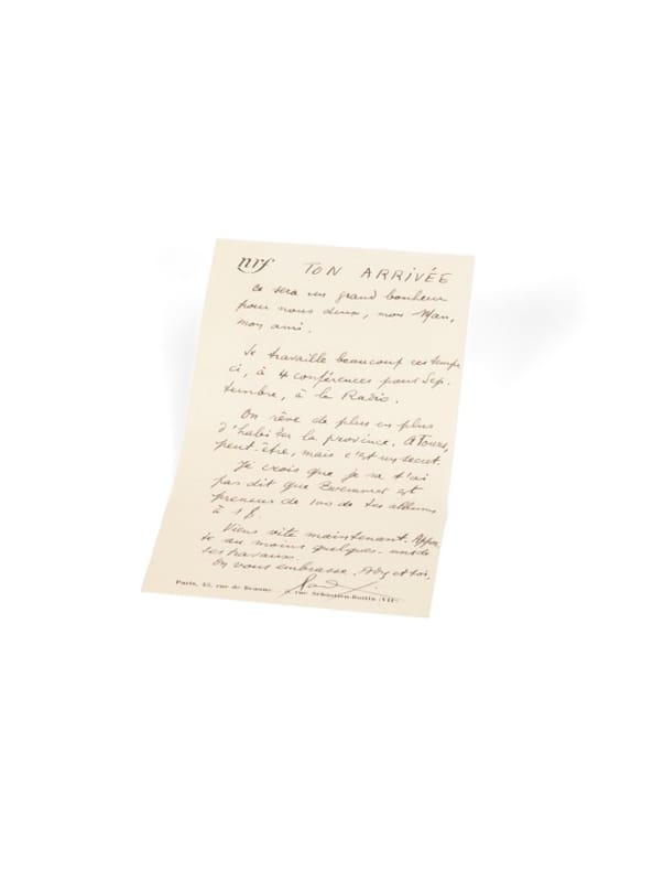 «TON ARRIVÉE. Ce sera un grand bonheur pour nous deux, mon Man, mon ami. Je travaille beaucoup ces temps-ci, à 4 conférences pour Septembre, à la Radio. On rêve de plus en plus d'habiter la Province. À Tours, peut-être, mais c'est un secret. Je crois que je n'ai pas dit que Zwemmer [Anton Zwemmer, libraire et éditeur néerlandais] est preneur de 100 de tes albums à 1$. Viens vite maintenant. Apporte au moins quelques uns de tes travaux. On vous embrasse, Ady et toi. Paul Eluard». Outre sa participation à quelques émissions radiophoniques après la guerre, Paul Éluard n'écrivit qu'une fois pour la radio, en 1947, pour la série Carte blanche à..., Le dit de la force de l'amour, une émission unique, avant d'accepter, en 1949, une série de cinq émissions, Les chemins et les routes de la poésie, dont seules les quatre premières peuvent encore être consultées à l'Institut national de l'audiovisuel (INA). C'est à ces émissions, réalisées par Alain Trutat et diffusées en octobre et novembre 1949, qu'Éluard semble faire référence. Le poète y travaillera tout l'été 1949 et la série constituera « un document on ne peut plus précieux pour saisir le type de relation que le poète entendait nouer avec ses contemporains. La poésie est un "bien commun" qu'il importe à l'écrivain de partager aussi largement que possible, tant par sa diffusion que par l'écoute et la compréhension de la parole de l'autre (...), une communauté qu'Éluard dessine et à laquelle il invite les auditeurs à s'identifier et tout simplement celle des survivants, appelée à se perpétuer dans l'engagement communiste, comme le suggère par la reprise d'un vers de «L'Internationale» qui terminera la première émission » (Céline Pardo, Le poète au micro et l'utopie poétique : Paul Éluard, Les chemins et les routes de la poésie, 1949, in Études littéraires, n° 41). Une émouvante lettre par ailleurs : le drame de la disparition de Nush, en novembre 1946 a laissé Paul Eluard longtemps désemparé, et sa seule consolation est la compagnie régulière de sa fille, Cécile. Si cette dernière est maintenant une femme - elle est âgée de 31 ans en 1949 - père et fille se voient fréquemment et envisagent de quitter Paris, ainsi qu'il est question ici. Trois mois plus tard, Paul Eluard rencontrera Dominique, à Mexico. Début d'une autre histoire.