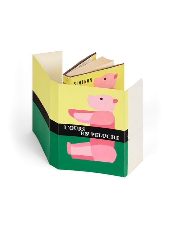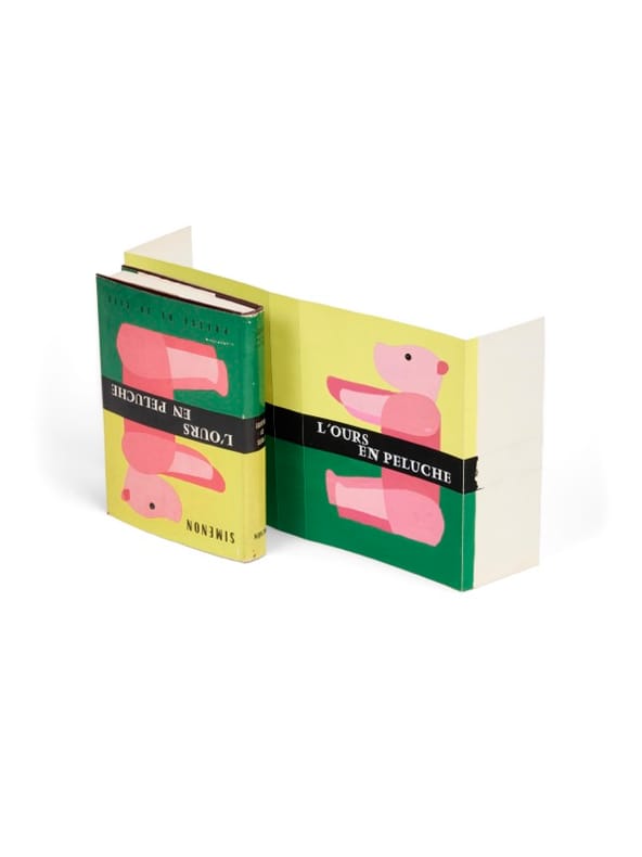 Maquette unique et originale pour la jaquette du livre. [1960]. Gouache et mine de plomb sur 1 f. canson (435 x 185 mm), tampon de l'atelier au dos. Maquette originale pour un projet de jaquette du roman paru aux Presses de la Cité en 1960. Elle comporte une annotation au dos : « Bon » de la main de Simenon.