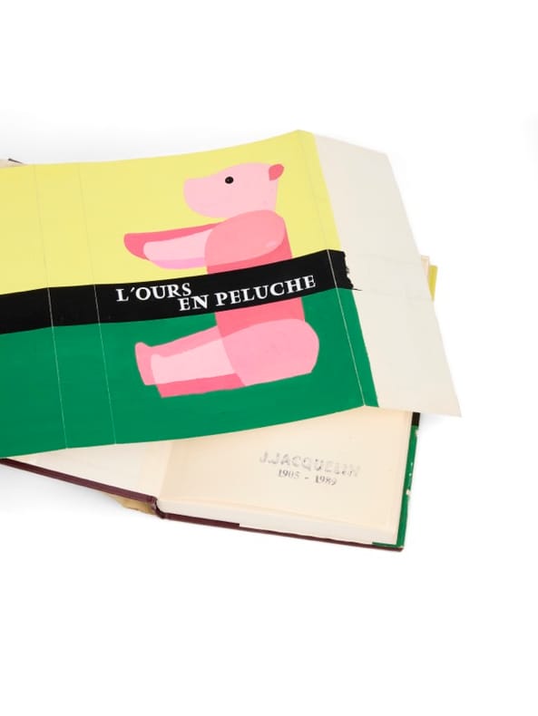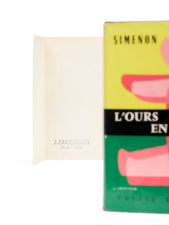On joint l'édition en volume, avec sa jaquette. Une autre version complètement différente ne sera pas retenue pour ce titre mais servira à illustrer la réédition du Temps d'Anaïs. Cet exemplaire provient des archives personnelles de l'illustrateur, Jean Jacquelin, avec tampon de la succession. Jean Jacquelin oeuvrera pour 27 romans de Simenon aux Presses de la Cité, entre 1957 et 1962. Avec un coup d'essai dès 1946, lors de la première réédition de Trois chambres à Manhattan, où il donne une première jaquette. Mais ce n'est que dix ans plus tard que Sven Nielsen, le patron des Presses de la Cité, lui confiera la réalisation des nouvelles illustrations, au moment où le graphisme des couvertures prend un nouveau tournant avec l'abandon des couvertures photographiques pour des couvertures illustrées. Jean Jacquelin, à cette date, est déjà un affichiste reconnu. Directeur artistique de l'agence Step à partir de 1929, il réalise plusieurs affiches de cinéma à partir de 1940 tout en poursuivant ses activités de dessinateur publicitaire pour de nombreux secteurs : automobile (Peugeot, Delage, Simca, Buick, Fiat), énergétique (Antar, Esso, Shell), presse écrite (Paris-Soir, L'Intransigeant, éditions Froissart, Presses de la Cité), mode (Scandale, Magasin Le Printemps), tourisme et voyage (SNCF, Air France, Aéropostale, Cie Transatlantique,...) et de nombreuses marques et événements (Crédit Foncier, 24 heures du Mans, Coop, Vittel, Casino d'Enghein, Brandt, Champagne Mercier, Semaine du cinéma, châteaux de la Loire...). Ses deux affiches les plus célèbres sont sans aucun doute celles pour Jour de fête de Jacques Tati et Casque d'or de Jacques Becker, avec Simone Signoret et Serge Reggiani. Une grande exposition lui a été consacrée en 1993 à la Bibliothèque Forney, doublée d'un catalogue richement illustré (Jean Jacquelin affichiste et dessinateur publicitaire ; Exposition Bibliothèque Forney du 29 avril au 28 mai 1993). Le travail de Jean Jacquelin aux Presses de la Cité a été le fruit d'une collaboration avec Georges Simenon, auquel il soumettait ses maquettes originales : l'auteur lui donnait (ou pas) son aval, en lui indiquant parfois quelques pistes. Plusieurs des maquettes, comme celle-ci, sont ainsi annotées par Simenon.