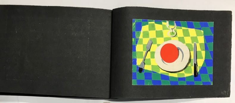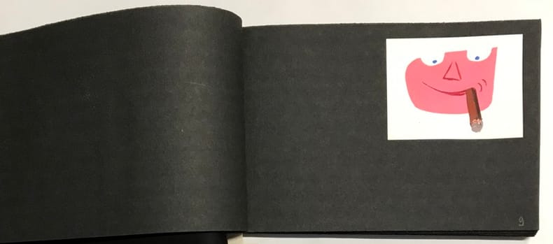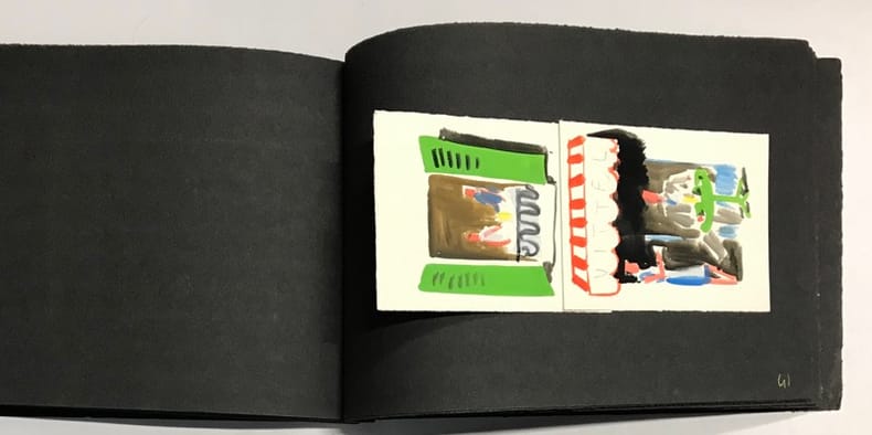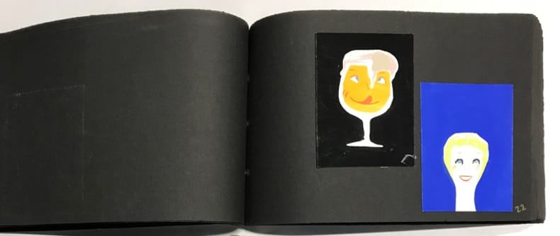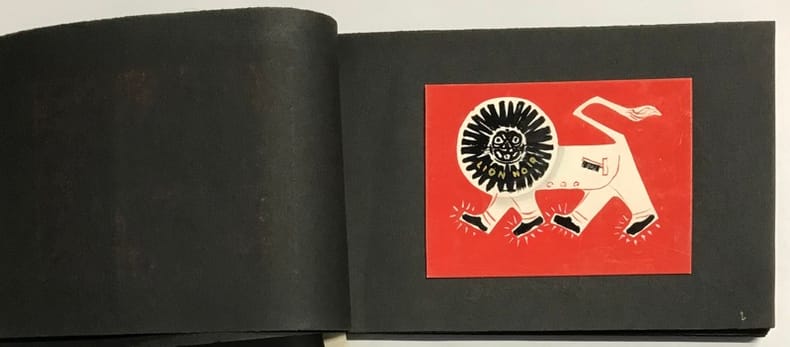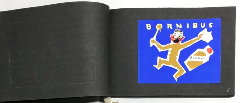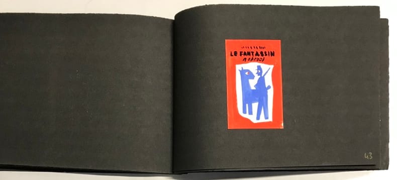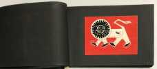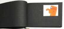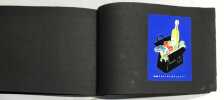 51 compositions publicitaires originales de Jean Jacquelin. S.l.n.d. [circa 1960]. Gouaches sur bristol de formats divers, contrecollees sur canson noir (255 x 170 mm), 47 p. ch., reliées par une cordelette. Ce carnet de croquis et maquettes contient de nombreux projets publicitaires : le cirage « Lion noir », la moutarde « Bornibus », les chaussures « André », « Coop », « Dubonnet », « Omo», « Vittel », et d'autres non identifiées. Au total, 51 compositions, uniques et originales.