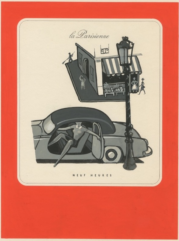 Campagne publicitaire pour Scandale. Maquette originale, à la gouache. S.l.n.d. [circa 1950]. Encre et gouache sur carton (300 x 400 mm), tampon de l'atelier au dos. Maquette originale pour les bas de la marque Scandale avec la légende : «la Parisienne - neuf heures».