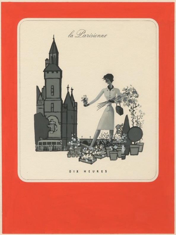 Maquette originale pour les bas « Scandale» S.l.n.d. [circa 1950]. Encre et gouache sur papier (240 x 320 mm), contrecollé sur carton (300 x 400 mm), tampon de l'atelier au dos. Maquette originale pour les bas de la marque Scandale avec la légende : «la Parisienne - dix heures».