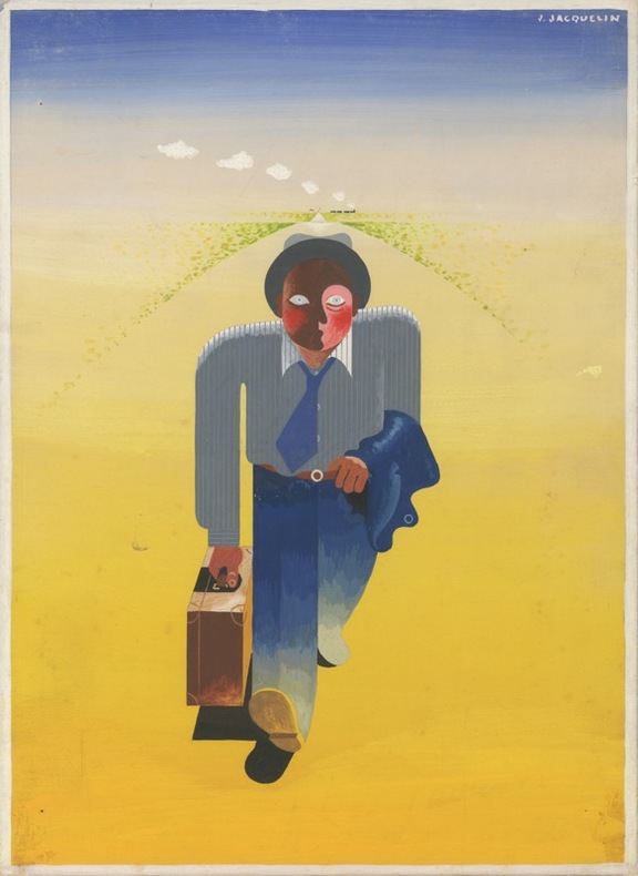 Remarquable composition frontale et silencieuse dans laquelle Jean Jacquelin déploie une scène d'apparente simplicité, au coeur d'un espace désertique saturé de lumière jaune : un homme seul avance sur une route parfaitement droite, valise à la main, veste sur l'épaule. À l'horizon, une ligne de nuages indique la fumée d'un train qui s'éloigne, symbole discret d'un départ ou d'un abandon. Son visage stylisé, rouge et sombre, capte l'attention par sa frontalité brutale, entre émotion rentrée et figuration abstraite : tout ici évoque la solitude du voyageur moderne, la quête silencieuse, la tension entre le mouvement et la fixité. Jacquelin synthétise en quelques aplats nets une parabole existentielle, dans la tradition graphique des affichistes humanistes de l'après-guerre. Par sa puissance symbolique et sa retenue formelle, cette oeuvre rejoint les grandes images de la condition humaine - errance, attente, passage. Un jalon rare et poétique dans l'oeuvre de Jacquelin. C'est à l'âge de dix ans que Jean Jacquelin découvre avec émerveillement les affiches Ripolin d'Eugène Vavasseur. Le natif de Paris intègre en 1920 l'école supérieure de dessin Germain Pilon, puis entre comme dessinateur dans l'agence de publicité TAP (Travaux artistiques de publicité). Directeur artistique de l'agence Step à partir de 1929, il réalise plusieurs affiches de cinéma à partir de 1940 tout en poursuivant ses activités de dessinateur publicitaire pour de nombreux secteurs : automobile (Peugeot, Delage, Simca, Buick, Fiat), énergétique (Antar, Esso, Shell), presse écrite et édition (Paris-Soir, L'Intransigeant, Éditions Froissart, Presses de la Cité), mode (Scandale, Magasin Le Printemps), distribution (Coop, Vittel, Brandt, Champagne Mercier) ou pour le secteur du tourisme, du voyage et des loisirs (Air France, SNCF, Aéropostale, Compagnie Transatlantique, Les Châteaux de la Loire, 24 heures du Mans, Semaine du cinéma, Casino d'Enghein). Son nom est également célèbre pour avoir été l'illustrateur des jaquettes des volumes des romans de Georges Simenon aux Presses de la cité (une trentaine de titres des années 50 sont des compositions originales, qu'il exécute sous le contrôle et l'accord du romancier).