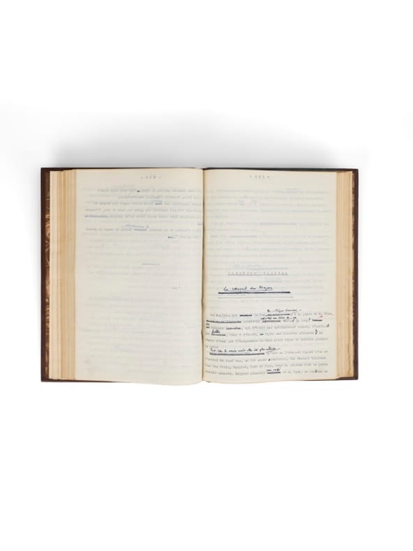 Seul manuscrit du roman Tumacacori [Tucson, Arizona], février 1949. 177 f. recto ch. 2 à 176, reliés en 1 vol. (190 x 270 mm). Basane marron, décor de filets à froid sur les plats, dos à nerfs, titre doré, chemise et étui. Unique manuscrit du roman paru en 1949 aux Presses de la Cité, sous la forme d'un tapuscrit abondamment corrigé par l'auteur.