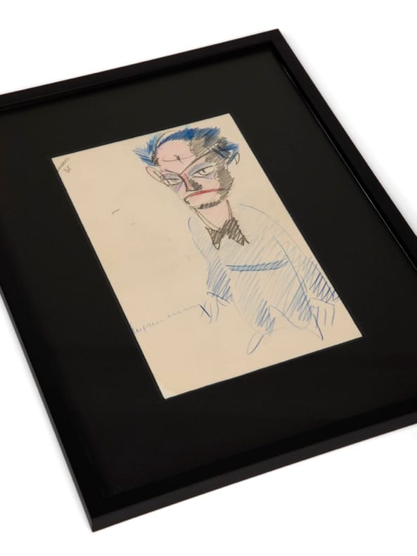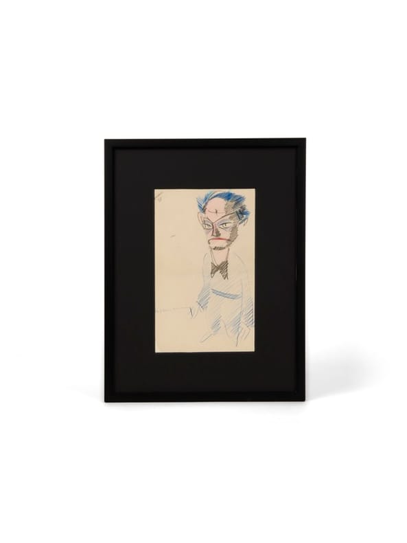 En marge de ses cahiers d'écolier, en marge de ses lettres d'enfants et plus tard de sa correspondance, sur des feuillets épars Antoine de Saint-Exupéry a toujours dessiné. S'il faut se garder de voir dans ces expressions graphiques les germes ou les prémisses des dessins du Petit Prince l'on ne peut s'empêcher cependant d'y penser. Ou plutôt le dessinateur nous y fait songer, dans une manière proche de la caricature. Les traits hachurés pour les ombres et les pleins, des bras le long du corps, quelques traits pour figurer la silhouette et la posture, autant de détails qui permettent de dater ce dessin de la période des « Feuillets de la comtesse de Vogüe », selon les différentes époques de dessins recensées dans Antoine de Saint-Exupéry. Dessins (Gallimard, 2006) par Delphine Delcroix. Ce portrait-charge pourrait à la fois entrer dans le chapitre de la « Scène fantastique » où Delcroix a réuni des personnages « de théâtre à la fois curieux, excentriques et mystérieux [...] dotés de grands yeux qui leur donnent un regard expressif, quelque peu effrayant » mais pourquoi pas aussi - et particulièrement pour ce dessin - une tentative d'autoportrait : le noeud papillon caractéristique, le regards et le front dégarni sont des attributs distinctifs que Saint-Exupéry utilise pour lui-même : il se rapproche particulièrement de l'autoportrait qui figurait dans la collection Bernard Loliée (vente Bibliothèque R. et B.L., Paris, Giquello, 2014, n° 196) : un regard d'une grande intensité, les cheveux de part et d'autre d'un crâne au front dégarni, les bras ballants et un large noeud papillon. Il est également à rapprocher du dessin reproduit p. 190 du catalogue Gallimard. Si les dessins sur feuillets libres non signés sont légions, les croquis en couleurs signés par Saint-Exupéry sont nettement plus rares. La qualité de celui présenté ici place ce dessin parmi les pièces les plus spectaculaires. Librairie Forgeot, Antoine de Saint-Exupéry, Cat., 2023, n° 19 (reproduit, "personnage caricatural signé").