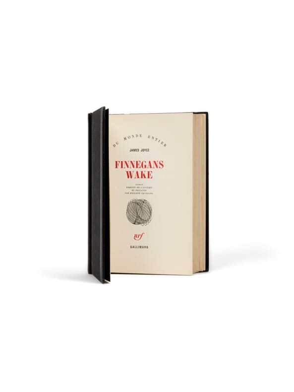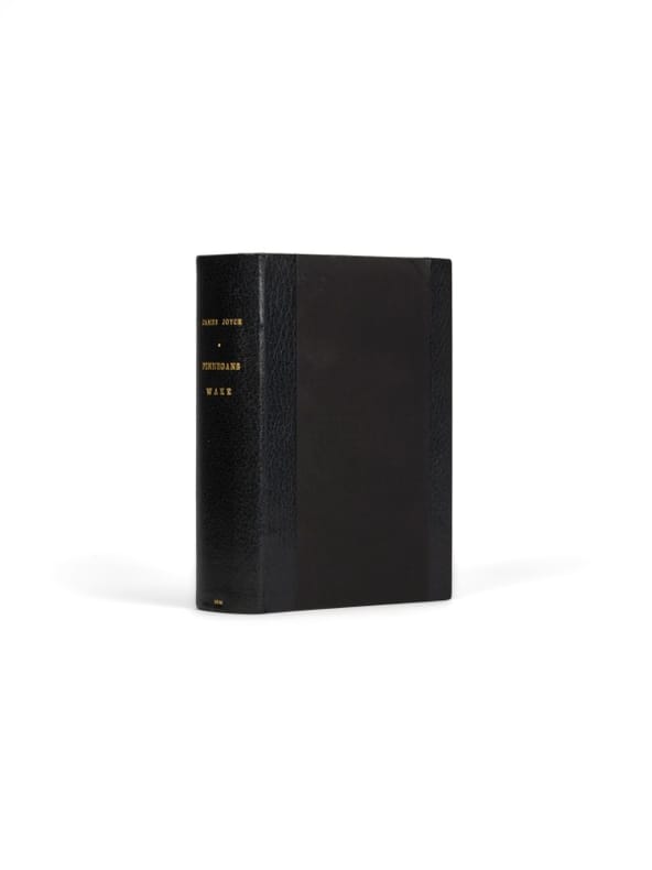 Après avoir terminé Ulysse, Joyce pensait qu'il avait achevé l'oeuvre de sa vie. Mais, le 10 mars 1923, il commença un texte qu'il nomma d'abord Work in progress, oeuvre plus ambitieuse encore dont il achève les deux premières parties en 1926. Elle seront publiées par Eugène et Maria Jolas, en feuilleton dans leur magazine Transition. C'est chez eux que, dix-sept ans après le début de sa rédaction, Joyce annoncera le titre final de son livre, qui comprend in fine 17 chapitres : Finnegans Wake sera publié en volume le 4 mai 1939. Réputé comme difficile, illisible et intraduisible, Finnegans Wake est néanmoins considéré comme un monument de la littérature du XXe siècle. Ce livre est dit « traduit de l'anglais » mais mêle en réalité plusieurs langues, à un tel point que certains spécialistes prétendent qu'il n'y a pas de langue de départ. La première traduction, incomplète et imparfaite, paraît en 1962 ; il faudra attendre la traduction de Philippe Lavergne en 1982 pour en avoir la première traduction intégrale. Bel exemplaire, bien établi par Lobstein-Laurenchet.