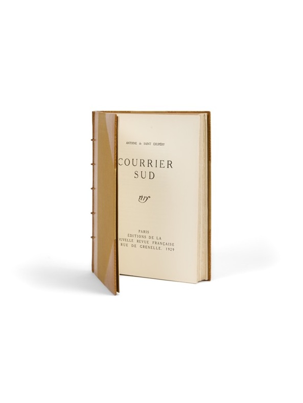 C'est en 1925 que Saint-Exupéry rencontre, dans le salon parisien de sa cousine Yvonne de Lestrange, la fine fleur des Éditions Gallimard : Gaston Gallimard, André Gide et Jean Schlumberger. Ces rencontres vont jouer un rôle fondamental dans l'entrée en littérature de Saint-Exupéry. Avant de tenter l'aventure de l'Aéropostale en Amérique du Sud, Saint-Exupéry fut envoyé à l'école de navigation aérienne de Brest pour un cours de perfectionnement. À cette adresse lui parvinrent les premières épreuves de son livre, dont il lut des passages à son cousin Honoré Estiennes d'Orves, son futur lecteur attitré. Il n'y apporta que d'infimes corrections et le bon à tirer fut signé aux premiers jours d'avril 1929. C'est une version très étoffée de la nouvelle L'Aviateur, publiée dans la revue le Navire d'argent en 1926. Publié grâce à André Gide, qui préfacera deux ans plus tard Vol de nuit, Courrier Sud est préfacé par André Beucler qui soutenait le premier l'idée que « Saint-Exupéry n'est pas un écrivain », idée reprise et développée par André Malraux : Saint-Exupéry n'est pas un écrivain en chambre et « il ne veut rien écrire que sa vie ne garantisse ou qu'il n'ait eu l'occasion de vérifier à ses dépens. C'est en quoi l'univers proprement littéraire lui demeure suspect pour autant qu'il trompe le lecteur en le transportant dans un monde facile et fallacieux. Saint-Exupéry reste l'un de ces hommes contraints à l'exactitude, pour qui l'imagination peut bien s'ajouter à la réalité, mais non pas en tenir lieu (...) ». Très bel exemplaire : il provient de la bibliothèque de Marcel de Merre (ex-libris et vente, Paris, Sotheby's, 2007, n° 436).