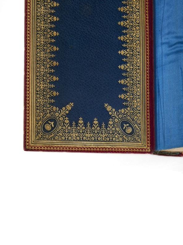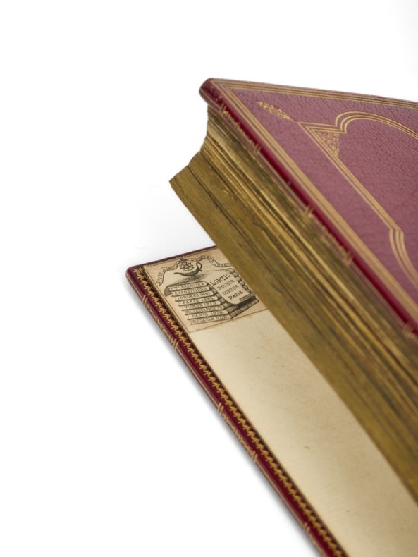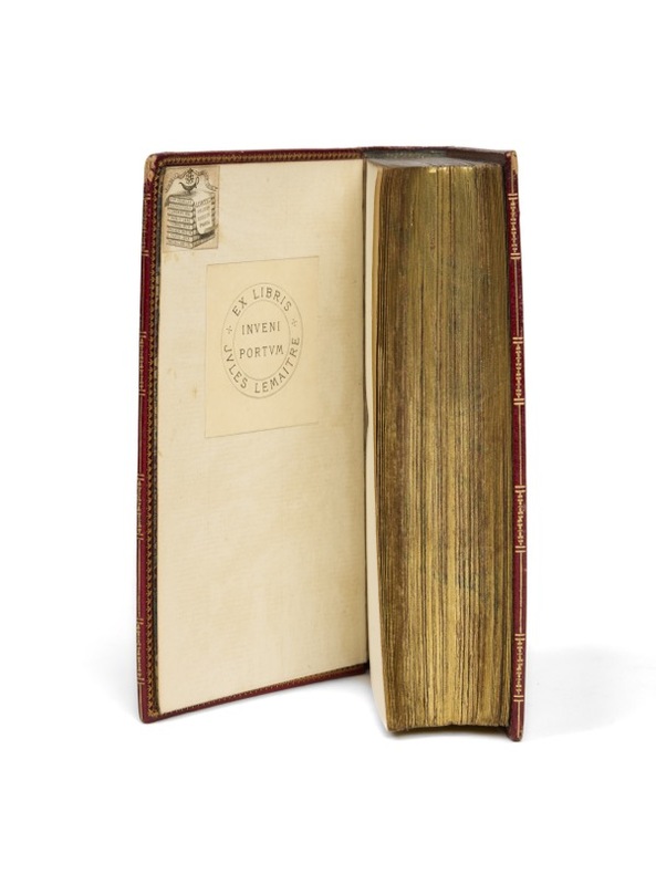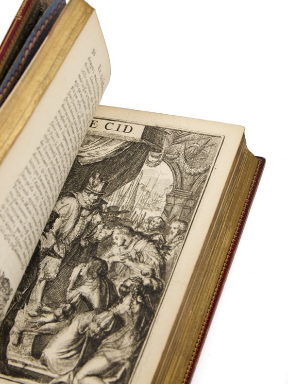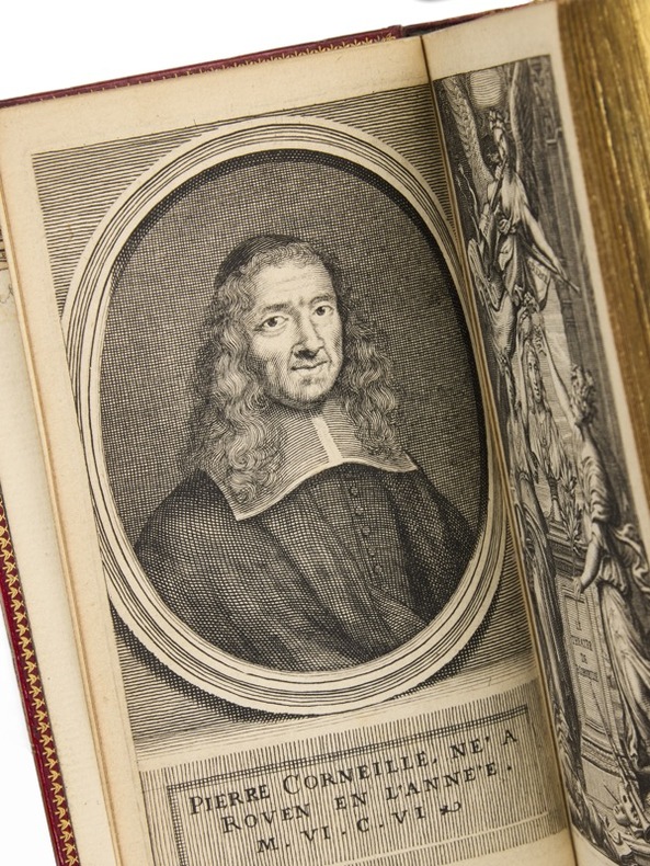 Tout Corneille : l'édition Wolfgang d'Amsterdam. Un des plus beaux exemplaires connus : celui d'Henri Bordes, relié par Lortic. [Amsterdam], Suivant la Copie imprimée à Paris, [Abraham Wolfgang], 1664-1678. 10 vol. (75 x 134 mm) de 1 portrait, 9 frontispices et 61 figures. Maroquin rouge, dos à nerfs ornés de caissons dorés, titre, tomaisons et dates dorés, au centre des plats médaillon ovale cerclé de petits fers et entrelacs dorés, encadré d'un double jeu de filets dorés, doublures de maroquin bleu, roulette et filets dorés encadrant une large dentelle dorée, fleurons d'angle, double garde peignée, tranches dorées sur marbrure (reliure signée de Pierre-Marcellin Lortic). Le théâtre complet de Pierre Corneille et Thomas Corneille : L’Illusion comique, Rodogune, Le Cid, Cinna ou Polyeucte... Exemplaire de choix, aux bonnes dates, sans exception (de 1664 à 1678) aux pedigrees impeccables : Pierre-Marcellin Lortic, Henri Bordes et Jules Lemaître. Cette édition est précisément décrite par Picot dans sa Bibliographie cornélienne, sous le n° 381. Elle est célèbre et contient d’admirables gravures, illustrant la totalité du théâtre des deux frères. Après les cinq premiers volumes de Pierre Corneille, l’éditeur poursuit jusqu’en 1678, avec les Tragédies et Comédies de son frère Thomas.