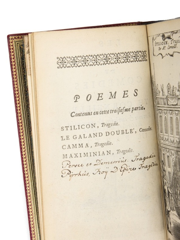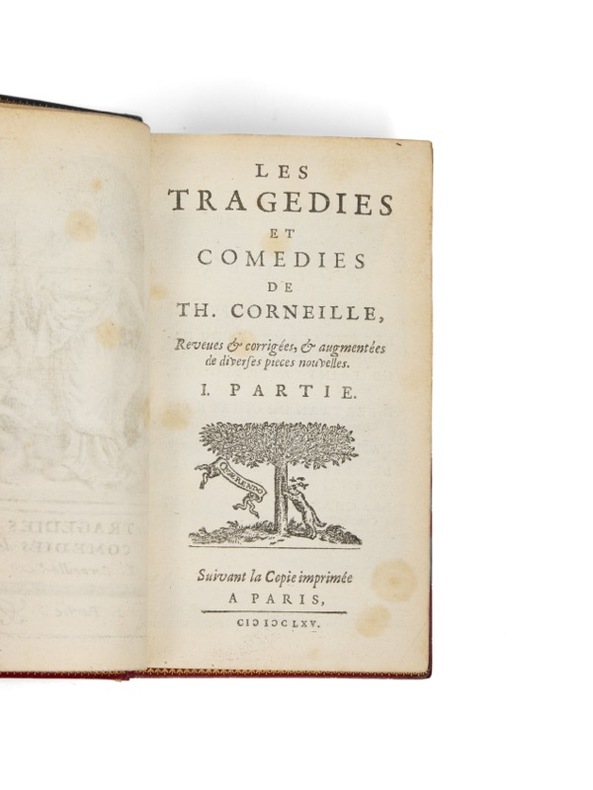 Un des plus beaux exemplaires connus de cette « charmante édition exécutée à Amsterdam par Abraham Wolfgang, et justement recherchée, sinon pour le texte lui-même, du moins pour la beauté de l’impression et du papier et pour l’élégance des figures. Cette édition a l’avantage de donner, non pas un choix, mais la suite complète des pièces de Corneille. Elle est devenue depuis quelques années, dit M. Brunet, un objet d’une très grande importance auprès des bibliomanes français, et il est fort difficile d’en trouver des exemplaires complets. » (Picot, 381). Assertion confirmée par Willems : « Cette collection est difficile à réunir. Les exemplaires qui ne laissent rien à désirer pour les dates des pièces et la grandeur des marges se paient fort cher. » C’est le cas de cet exemplaire, en exceptionnelle condition et d’une grande hauteur de marges (134 mm). Toutes les pièces, figures, titres généraux et frontispices sont bien présents, ainsi qu’une grande partie des feuillets blancs qui séparent parfois les pièces. Il est bien complet de l’avis de l’imprimeur au lecteur et du portrait au tome 1, souvent manquants. Les 5 volumes du Théâtre de Pierre Corneille portent tous la marque d’Abraham Wolfgang, signée « Quarendo » et dite au « Renard guettant sa proie » : Partie I : portrait de Corneille, sans nom de graveur ; frontispice gravé représentant le buste de Corneille couronné par deux ‘Renommées’, avec ce titre : « Le Théâtre de P. Corneille » ; 5 f. pour l’« Avis de l’Im- primeur au Lecteur » (avis signé A. W.) et la table des pièces de Pierre Corneille et de Thomas Corneille ; 74 p. pour le « Discours du Poëme dramatique » et les « Examens ». Suivent les huit pièces (de Mélite à l’Illusion comique), chacune, précédée d’une figure et d’un titre, avec une pagination distincte. Partie II : frontispice gravé représentant deux ‘Amours’, dont l’un déploie un voile sur lequel on lit : « Le Théâtre de P. Corneille », et l’autre gravant des armes sur une pierre ; 1 f. pour le titre, 92 p. contenant le « Discours de la Tragédie » et les « Examens ». Suivent les 7 pièces (du Cid à la Suite du Menteur), chacune précédée d’une figure et d’un titre, avec une pagination distincte. Partie III : frontispice gravé, représentant la ‘Vérité’ debout sur une sphère entourée de rois orientaux tenant une écharpe sur laquelle on lit : « Le Théâtre de P. Corneille » ; 1 f. pour le titre ; 68 p. pour le « Discours des trois Unitez » et les trois « Examens ». Suivent les 7 pièces (de Rodogune à Œdipe), chacune précédée d’une figure et d’un titre, avec une pagination distincte. Partie IV : frontispice gravé ; 1 f. pour le titre ; 4 f. pour l’« Avertissement » pour Sertorius. Suivent les 4 pièces (de Sertorius à Othon) chacune précédée d’une figure et d’un titre, avec une pagination distincte. Partie V : frontispice gravé. Suivent 5 pièces (de Agesilas à Surena) chacune précédée d’une figure, d'un avis « Au lecteur » et d’un titre, avec une pagination distincte. Ces 5 volumes sont complétés par les œuvres de son frère, Thomas Corneille : Partie I : 2 f. pour le frontispice gravé et le titre. Suivent 6 pièces (des Engagemens du hazard au Berger extravagant). Chaque pièce a une figure, un titre et une pagination séparée, avec pour certaines une « Epistre ». Partie II : 2 f. pour le frontispice gravé et le titre. Suivent 6 pièces (de Le Geolier de soy mesme à Darius). Chaque pièce a une figure, un titre et une pagination séparée. Partie III : 2 f. pour le frontispice gravé et le titre. Suivent 6 pièces (de Stilicon à Pyrrhus, roy d’Epire) dont les 4 premières seulement sont mentionnées, les 2 dernières Pyrrhus, roy d’Epire et Persée... sont ici bien présentes, les titres ayant été ajoutés anciennement à l’encre dans la liste. Chaque pièce a une figure, un titre et une pagination séparée. Partie IV : 2 f. pour le frontispice gravé et le titre. Suivent 6 pièces (de Antiochus à La Mort d’Annibal. Chaque pièce a une figure, un titre et une pagination séparée, avec pour certaines une « Epistre ». Partie V : 2 f. pour le frontispice gravé et le titre. Suivent 6 pièces (de Ariane au Comte d’Essex), mais chaque pièce a une figure, un titre et une pagination séparée, avec pour certaines un « Argument », une note pour la « Décoration du prologue » et un avis « Au lecteur ». Élu au fauteuil 14 à l’Académie française, en 1647, Pierre Corneille en était le doyen lorsqu’il mourut en octobre 1684. Tous les membres de l’Académie s’en émurent et proposèrent à son frère, affligé, de pourvoir au siège vacant. Il y sera élu à l’unanimité le 2 janvier 1685 ; Thomas ne pouvant décemment faire l’éloge de son frère qu’il remplace, ce fut Racine qui s’en chargea en même temps qu’il recevait Thomas et cela reste l’unique exemple de deux discours, d’hommage et de réception, par le même académicien dans l’histoire de l’institution. Voltaire dit du frère cadet, qu’exception faite de Racine il était le seul de son temps qui fût digne d’être le premier au-dessous de son frère. C’était un homme qui aurait une grande réputation s’il n’avait point eu de frère ». Bon grammairien, Thomas Corneille écrivit un Dictionnaire des arts et des sciences et un Dictionnaire universel géographique et historique. À l’Académie, il recevra Fontenelle le 5 mai 1691. Exceptionnelle réunion des œuvres des deux frères, en parfaite condition. L’exemplaire a été établi avec un soin délicat et attentionné par Pierre-Marcellin Lortic, puis vendu à Henri Bordes. Né à Saint-Gaudens le 4 avril 1822, le Gascon Pierre-Marcellin Lortic, dit « le Frondeur », arrive à Paris à la fin des années 1830 et intègre comme ouvrier l’atelier de Pierre-Paul Gruel : l