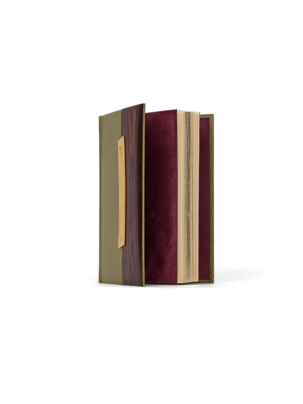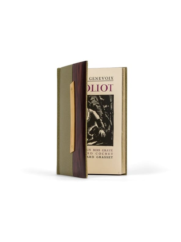 n° 1 sur papier de Chine, pour Genevoix.Reliure de Renaud Vernier Paris, Bernard Grasset, (29 septembre) 1925. 1 vol. (115 180 mm) de 349 p et [1] f. Buffle vert olive à décor de bois de violette et de buis, dos lisse, titre doré, tranches dorées sur témoins, doublures et gardes de chèvre velours violet, couvertures et dos conservés, chemise, étui (reliure signée de Renaud Vernier, Maître d'art, ED. Claude Ribal, dorure sur tranches de Jean-Luc Bongrain, 2025). Édition originale. Un des 7 premiers exemplaires sur chine (n° I).