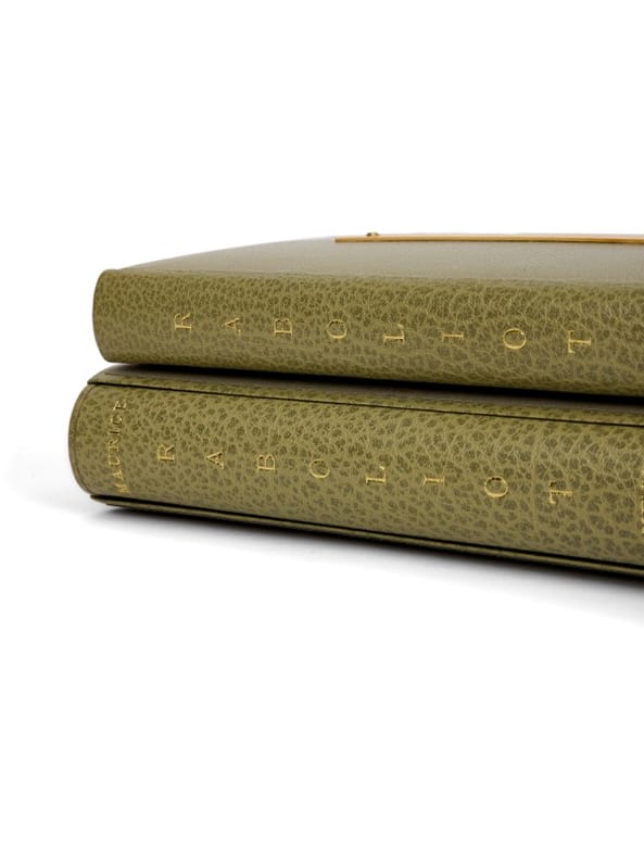 Le principe du braille est d'utiliser le sens du toucher pour l'écriture et la lecture au moyen de points en relief : il doit son nom à Louis Braille qui, devenu aveugle par accident à l'âge de trois ans, fit ses études à l'Institution Royale des Jeunes Aveugles de Paris. En 1821, il prit connaissance d'une méthode d'écriture en points en relief inventée spécifiquement pour les aveugles par Charles Barbier de la Serre, lequel propose une écriture phonétique composée de 12 points maximum ainsi qu'une écriture alphabétique composée de 10 points maximum. Après plusieurs années de recherches fondées sur cette méthode alphabétique, Louis Braille publia en 1837 son propre système, à six points, qui simplifie le procédé tout en le rendant encore plus efficace : c'est l'écriture orthographique braille telle que nous la connaissons encore aujourd'hui. Rare édition de Raboliot, embossée, destinée à la seule lecture tactile en braille : aucun texte visible à l'encre n'est présent, hormis le titrage au dos des volumes. Non commerciale, elle est réalisée à l'initiative de l'Association pour les Aveugles, fondée en 1917 par Mme Chambet‑Chenault, qui a pour objet la prise en charge et la réinsertion des personnes aveugles. Un centre de rééducation pour aveugles récents est créé en 1963 au Domaine des Ombrages, à Marly-le-Roi : un établissement national et pionnier puisque c'est la première structure de ce type en France pour l'accompagnement des personnes devenant déficientes visuelles à l'âge adulte. Cette édition de Raboliot y est publiée, et cet exemplaire offert à Maurice Genevoix, enrichi d'une est carte autographe signée de M. Chambet, en date du 29 novembre 1967, adressée au Secrétaire perpétuel de l'Académie française, en hommage à son soutien à l'Association : « En hommage de gratitude à Monsieur Maurice Genevoix (...) pour l'intérêt qu'il eut bien voulu porter à l'Association ‘Pour les Aveugles' et à sa Présidente-Fondatrice. » L'ouvrage se compose de deux forts volumes, probablement produits à un très faible tirage pour un usage institutionnel, et réservés à la consultation dans des centres spécialisés. Le fait que Raboliot ait été transcrit en braille montre que le roman a été considéré comme fondamental dans les programmes de lecture accessibles et, au-delà du lectorat "classique", comme titre majeur de la mémoire nationale, justifiant sa présence dans les fonds destinés aux aveugles et malvoyants. De la bibliothèque de Maurice Genevoix, aux « Vernelles » (ex-libris).