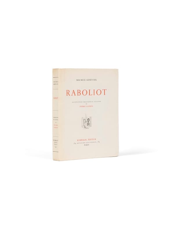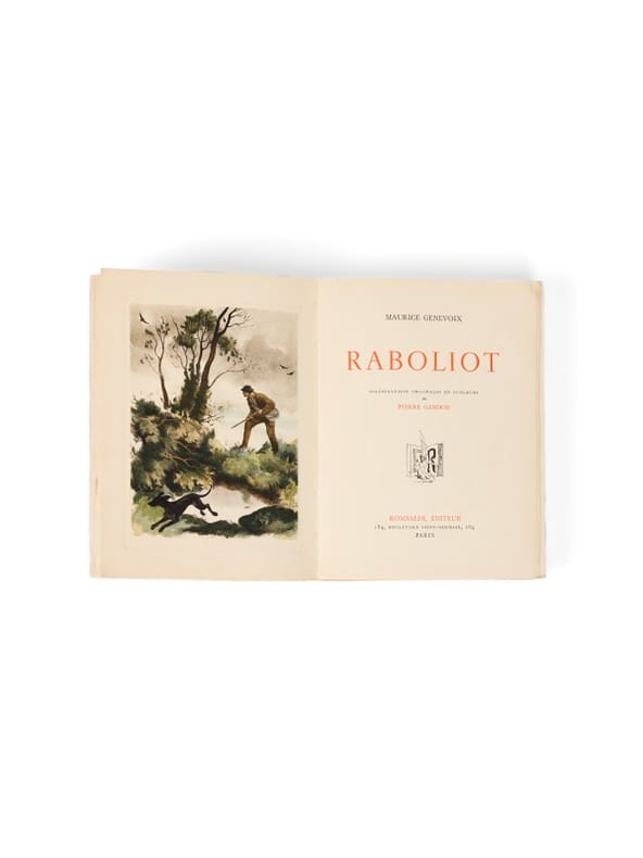 C'est la cinquième édition illustrée de Raboliot, celle-ci est publiée par les Éditions Rombaldi, fondées en 1932 par Toussaint Rombaldi et spécialisées dans la réédition de textes classiques ou contemporains dans un esprit bibliophilique, avec le concours d'artistes de renom (Chimot, Lobel-Riche, Chahine, Marquet,...). Les illustrations sont dues à Pierre Gandon (1899-1990), élève de l'École Estienne, formé à la gravure par Antoine Dezarrois (également maître d'Albert Decaris), puis admis aux Beaux-Arts de Paris. Il obtient à 22 ans le Grand Prix de Rome de gravure, puis en 1926, le Prix de la Ville de Paris. Dessinateur virtuose, Gandon est notamment célèbre pour ses timbres-poste, qu'il commence à concevoir dès 1941, puis sous la IVe République - ses portraits de Marianne ou de Pasteur sont restés emblématiques. Il poursuivra une longue carrière dans la gravure d'interprétation et la philatélie, illustrant également de nombreux livres. Dans cette édition de Raboliot, ses aquarelles délicates apportent une touche bucolique et stylisée au roman de Genevoix, en phase avec le goût des éditions Rombaldi. De la bibliothèque de Maurice Genevoix, aux « Vernelles » (ex-libris).