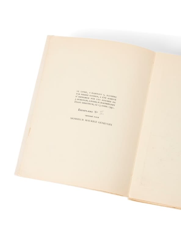 Exemplaire nominatif pour Maurice Genevoix Paris, Rombaldi, (15 avril) 1941. 1 vol. (155 x 205 mm) de 262 p., [2] et 1 f. Broché. Édition illustrée de 5 hors texte en couleurs de P. Gandon. Exemplaire nominatif imprimé pour Maurice Genevoix (n° II), justifié à l'encre.
