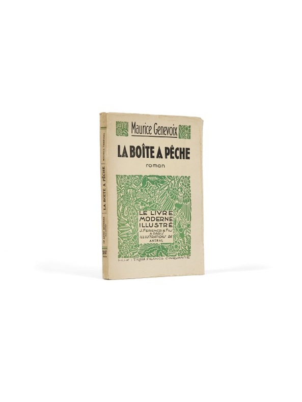 Un an après Raboliot (Goncourt, 1925), c'est vers la Loire, à la suite de la Sologne, que se tourne Genevoix. Il est revenu vivre après 1919, à Châteauneuf-sur-Loire, près des lieux pour lesquels il avait déjà donné, quatre ans plus tôt, un merveilleux Rémi des Rauches, qui mettait déjà en scène avec bonheur le fleuve-roi par la grâce d'un tonnelier, offrant au lecteur de magnifiques descriptions qui sont autant d'invitations au voyage. La Loire était même le dédicataire de son roman, c'est dire. La Boîte à pêche est, de prime abord, une évocation quasi ethnographique des diverses formes de pêche et du plaisir qu'elles procurent : un roman «du terroir», que le milieu intellectuel parisien a taxé de « régionaliste » avec ses oeillères habituelles ; pour sa part, Genevoix le justifie par la nécessité de conjurer le souvenir de la barbarie de la première guerre, toujours vive, ainsi qu'il l'exprime dans son avant-propos, en hommage au maître à pêcher, Najard, et aux camarades de collège et de pêche, Bailleul et Jeanneret. C'est à la faveur du succès de Raboliot, de Rémi des Rauches et de La Boîte à pêche - trois textes imprégnés d'un vocabulaire d'une exceptionnelle richesse sensorielle, que Genevoix pourra, en 1927, acquérir la maison des Vernelles, à Saint-Denis-de-l'Hôtel. Il y aménagera un bureau face à la Loire, et y écrira une grande partie de son oeuvre à venir.Précieux exemplaire de tête, qui provient de la bibliothèque de l'auteur, aux «Vernelles», avec ex-libris.