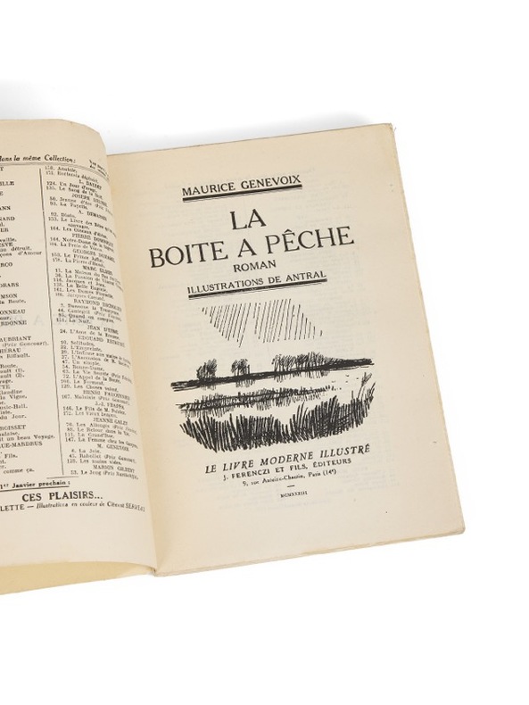 Dans le domaine des éditions littéraires bon marché, deux éditeurs concurrents se disputent, à partir de 1923, celui des éditions illustrées : Fayard et Ferenczi. Le premier avec sa collection « Le Livre de demain», lancée en février 1923, le second avec « Le Livre moderne illustré» lancée en juin de la même année. Elles sont emblématiques du renouveau du livre illustré par la gravure sur bois dans le contexte de la démocratisation du livre de luxe : « Ces deux collections, concurrentes, ont vulgarisé la littérature française pour deux à trois générations... Leur succès, à l'époque, provenait notamment de leurs illustrations, des gravures sur bois pour l'essentiel. Ce corpus de gravures est, de loin, le plus important, numériquement, des productions de l'entre-deux-guerres - de l'ordre de dix mille bois originaux, c'est-à-dire dessinés et gravés par le même artiste.» (Jean-Michel Galland, « Les gravures sur bois des collections Fayard et Ferenczi », Nouvelles de l'estampe, n° 254). La collection « Le livre moderne illustré» chez Ferenczi sera suivie jusqu'en 1954, avec un total de 366 parutions. Ses couvertures, connues des amateurs et bibliophiles, sont facilement reconnaissables grâce au bois monochrome à motifs « fleuris et animaliers », dans le style art déco, placé dans une composition conçue par Clément Serveau ; ce dernier, après avoir suivi les cours de l'École nationale des arts décoratifs puis de l'École nationale supérieure des beaux-arts de Paris de 1904 à 1914, devient directeur artistique des éditions Ferenczi dès 1919. Il illustrera, à l'aide de la technique du bois gravé, soixante-dix-huit des ouvrages de la collection, dont Colette assurera la direction littéraire pendant plusieurs années. Les gravures sur bois des artistes sont reproduits « grâce au précieux procédé de la galvanoplastie, consistant en un clichage sur cuivre appelé galvano, qui reproduit à merveille les valeurs du bois original à s'y tromper, permettant pour les grands tirages de ne pas imprimer sur les bois mêmes, qu'on risque de fatiguer ou de briser par un foulage excessif. » (Carteret, Le Trésor du bibliophile : livres illustrés modernes).La plupart des écrivains français des années 1920 à 1940 eurent des oeuvres publiées dans cette collection populaire : Francis Carco, André Malraux, Georges Duhamel, Colette, Francis de Miomandre, François Mauriac, Joseph Kessel, Raymond Radiguet, François Mauriac, André Maurois, Irène Némirovsky, Blaise Cendrars ou Paul Morand. Peu d'auteurs étrangers y figurent, mais on notera la présence de Stefan Zweig. Maurice Genevoix entra dans la collection en 1926, avec La Joie. Suivra Raboliot en 1927, Les Mains vides en 1931 et cette Boîte à pêche en 1933.De la bibliothèque de Maurice Genevoix, aux « Vernelles » (ex-libris).