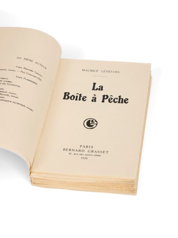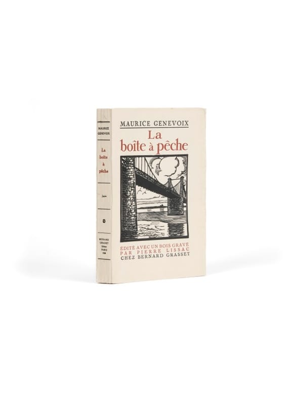 Un an après Raboliot (prix Goncourt 1925), installé dans la maison de son père à Châteauneuf-sur-Loire, où il est revenu vivre après la guerre, Maurice Genevoix se tourne vers le fleuve de son enfance. Il avait déjà, quatre ans plus tôt, offert un merveilleux Rémi des Rauches, qui faisait la part belle à la Loire, par la grâce d'un tonnelier visionnaire et d'une langue évocatrice. Le fleuve y était déjà omniprésent, jusqu'à devenir le dédicataire du roman. La Boîte à pêche est, de prime abord, une évocation quasi ethnographique des formes de pêche en Loire, et du plaisir profond qu'elles procurent : un roman « du terroir », que le milieu intellectuel parisien a vite classé parmi les écrits « régionalistes », avec les oeillères qui lui sont coutumières. Genevoix revendique pourtant cette veine avec force - et tendresse : elle est, pour lui, une réponse à la barbarie, un antidote à la guerre, comme il l'écrit dans son avant-propos, en hommage à trois figures tutélaires : Najard, le maître à pêcher ; Bailleul et Jeanneret, les camarades d'enfance, de collège et de pêche. C'est à la faveur du succès de Raboliot, Rémi des Rauches et La Boîte à pêche - trois textes imprégnés d'un vocabulaire d'une exceptionnelle richesse sensorielle - que Genevoix pourra, en 1928, acquérir la maison des Vernelles, à Saint-Denis-de-l'Hôtel. Il y aménagera un bureau face à la Loire, et y écrira une grande partie de son oeuvre à venir. De la bibliothèque Maurice Genevoix (ex-libris).