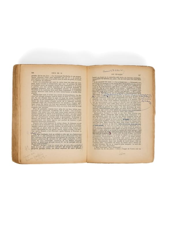 Ceux de 14 rassemble les récits de guerre de Maurice Genevoix. Rappelons que, jeune normalien, Maurice Genevoix intègre en septembre 1914 le 106e régiment d'infanterie et part combattre en Argonne, notamment à la Tranchée de Calonne : il y est grièvement blessé six mois plus tard, le 25 avril 1915 de trois balles, deux au bras et une à la poitrine. Après sept mois de soins, il rentre à Paris, rue d'Ulm et, sous les encouragements du secrétaire général de l'École normale supérieure, Paul Dupuy, avec qui il avait longuement correspondu pendant l'enfer de ces six mois, il accepte de relater son expérience du front et publie Sous Verdun, en avril 1916. Suivront Nuits de guerre, en mai 1917, Au seuil des guitounes, en septembre 1918, La Boue, en février 1921, et enfin Les Éparges, en septembre 1921 : une oeuvre à la fois historique et littéraire qui figure au premier rang des témoignages publiés sur la Grande Guerre. Intéressant exemplaire de travail considérablement annoté, en vue à la fois d'une lecture publique et pour la nouvelle édition Flammarion, qui interviendra, dans une version cartonnée, en 1965. Le texte sera lu pour la section qui narre l'assaut sur la butte des Éparges. De Ceux de 14, Maurice Genevoix avait conservé le manuscrit original (aujourd'hui à la BnF), deux exemplaires de travail et plusieurs exemplaires de l'édition originale dans son bureau-bibliothèque des «Vernelles», sa demeure sur les bords de Loire, près d'Orléans. Mention de mille en couverture. De la bibliothèque de Maurice Genevoix, aux « Vernelles », avec ex-libris.