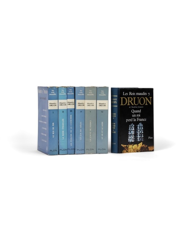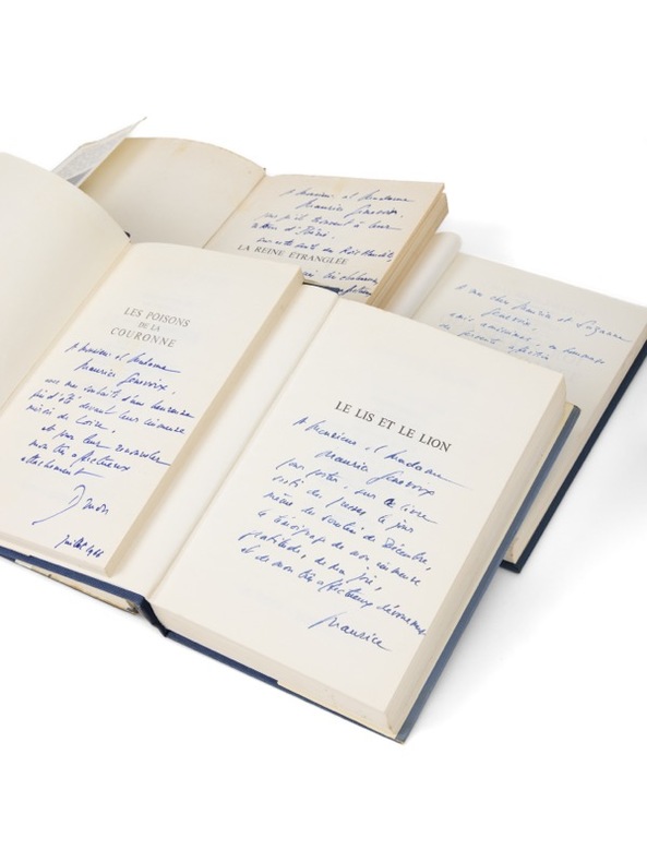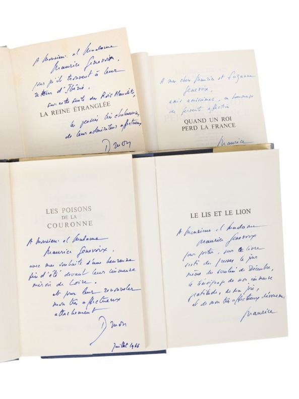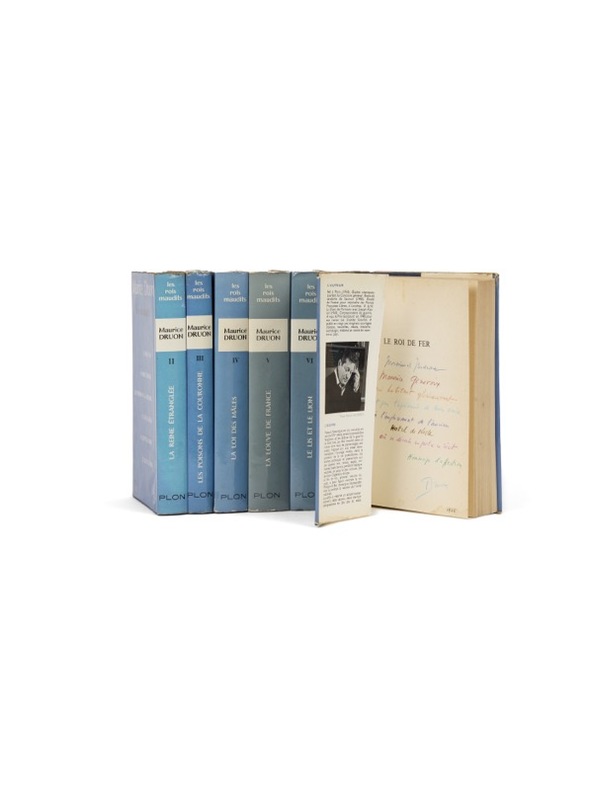 D'un secrétaire perpétuel à un autre.Les Rois Maudits, exemplaire Genevoix Paris, Del Duca, 1965-1966. 7 vol. (140 x 210 mm). Cartonnages et jaquettes illustrées de l'éditeur. Première édition Plon. Tous les volumes sont dans le premier tirage. Envois signés sur cinq tomes : « À Monsieur et Madame Maurice Genevoix qui habitent glorieusement et pour l'agrément de leurs amis, à l'emplacement de l'ancien Hôtel de Nesle où se déroule en partie ce récit. Hommage d'affection, Druon, 1966 » ; « À Monsieur et Madame Maurice Genevoix, pour qu'ils trouvent à leur retour d'Ibérie, sous cette tente des Rois maudits, les pensées très chaleureuses de leur admirateur affectueux, Druon, Juillet 1966 » ; « À Monsieur et Madame Maurice Genevoix, avec mes souhaits d'une heureuse fin d'été devant leur immense miroir de Loire, et pour leur renouveler mon très affectueux attachement, Druon, Juillet 1966 » ; « À Monsieur et Madame Maurice Genevoix pour porter sur ce livre sorti des presses le jour même du scrutin de Décembre, le témoignage de mon immense gratitude, de ma joie, et de mon très affectueux dévouement, Maurice » ; « À mes chers Maurice et Suzanne Genevoix, amis, en hommage de fervente affection, Maurice ».