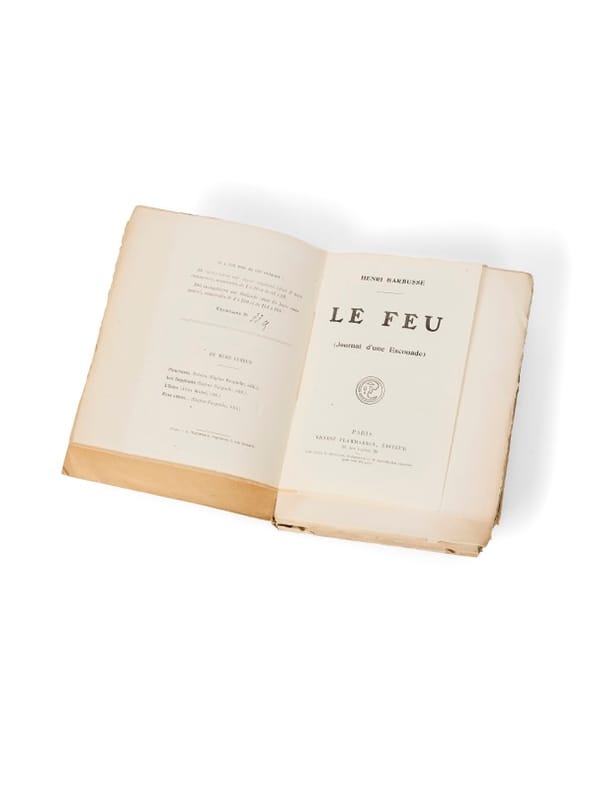 Henri Barbusse avait connu le feu des tranchées dès 1915, d'abord comme soldat puis comme brancardier. C'est principalement des hôpitaux que Barbusse, en vingt-quatre chapitres, témoigne de son quotidien et de la « fatigue épouvantable, surnaturelle, et l'eau jusqu'au ventre, et la boue, et l'odeur et l'infâme saleté, surnageant sur la terre vorace », écrivant depuis un carnet de guerre où il avait noté ses expériences vécues. Le roman est prêt à la toute fin dès le printemps, et l'idée du Goncourt est déjà en germe pour ses éditeurs, avant même la signature du contrat. La parution des premiers chapitres, sous forme de feuilleton dans le quotidien L'OEuvre, débute le 3 août : les frères Fischer, directeurs littéraires de Flammarion, flairent la bonne affaire et contactent l'auteur pour acheter les droits du Feu. Le 26 octobre, à la veille d'une réunion préparatoire de l'Académie, ils lui écrivent : « Nous avons parlé de la possibilité que nous entrevoyions relativement au Goncourt. Certaines conversations que nous avons eues ces jours-ci, notamment avec Paul Margueritte, nous font croire que nous ne nous étions pas tout à fait trompés. Mais il faudrait aller bigrement vite pour cela. » Barbusse hésite, lié à d'autres éditeurs, mais la perspective du Goncourt le décide. Une semaine plus tard, le contrat est signé - six jours avant la fin de la parution en feuilleton (93 livraisons). Le 15 novembre, le texte part à l'impression et paraît in extremis chez Flammarion début décembre, dans un tirage initial de 1 000 exemplaires, dont les grands papiers : 33 sur japon et 165 sur hollande. Barbusse obtient le Goncourt au premier tour de scrutin, le 15 décembre, avec huit voix, sans celle de Léon Daudet ni d'Elémir Bourges, comme il l'avait anticipé. Un tirage spécial limité à 20 exemplaires pour la société de bibliophiles « Les XX» existe, tous signés par l'auteur.