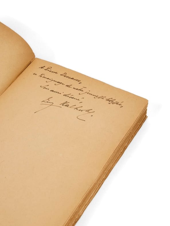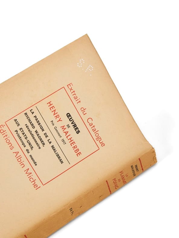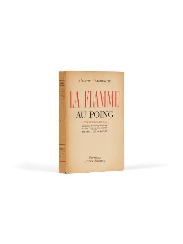 Presque trois décennies après son prix Goncourt de 1917, Henry Malherbe republie La Flamme au poing dans une édition profondément marquée par le double traumatisme des deux guerres mondiales. Le texte initial est accompagné d’un essai liminaire — Vues sur la guerre 1914–1945 — dans lequel l’auteur, rescapé des deux conflits, revient sur les idéaux sacrifiés de sa génération. Cette édition de 1945 donne un éclairage nouveau à l’ouvrage original, en replaçant la geste héroïque de 1914–1918 dans la continuité dramatique du XXe siècle. L’envoi à Pierre Descaves, écrivain et homme politique engagé, et fils de Lucien Descaves qui l'avait couronné du Goncourt, renforce encore la valeur mémorielle de l’exemplaire.