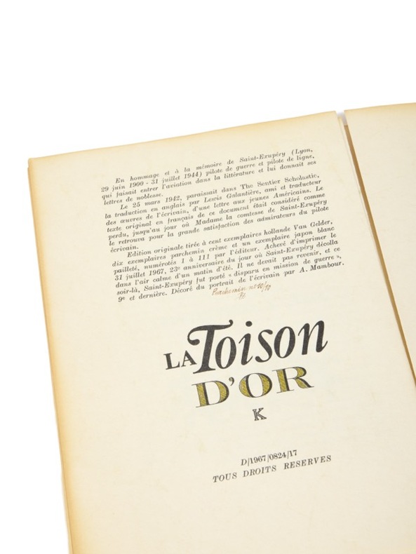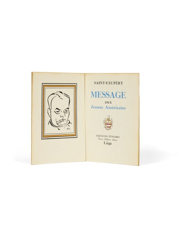 L'allocution de Saint-Exupéry pour la jeunesse étudiante américaine. Un des dix exemplaires de tête sur parchemin. Liège, Ed. Dynamo, (31 juillet) 1967. 1 vol. (180 x 260 mm) de 15 p. Broché. Édition originale. Portrait de l'auteur en frontispice. Un des 10 premiers exemplaires sur parchemin, justifiés et paraphés par l'éditeur (n° 10) - après un exemplaire unique sur japon.