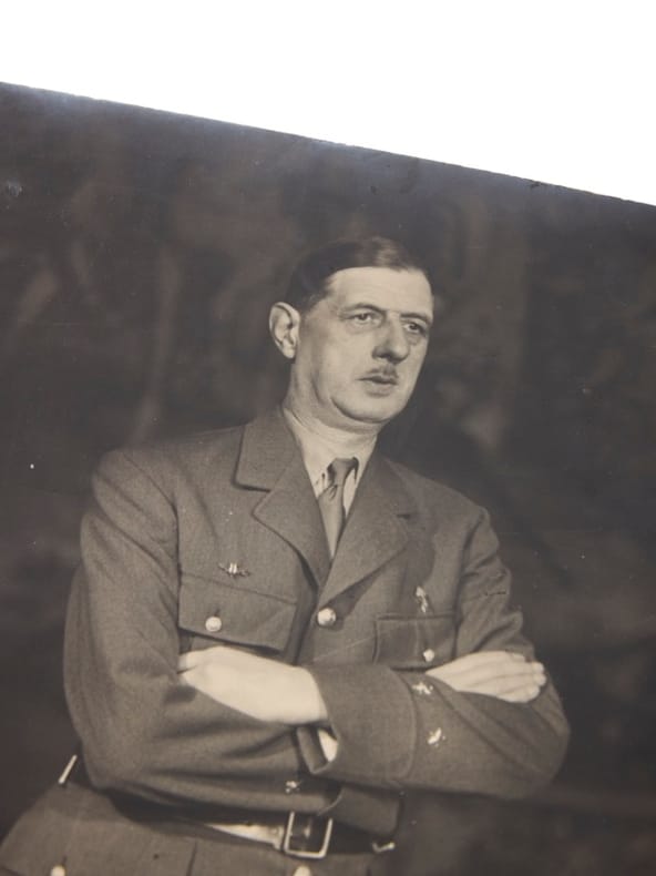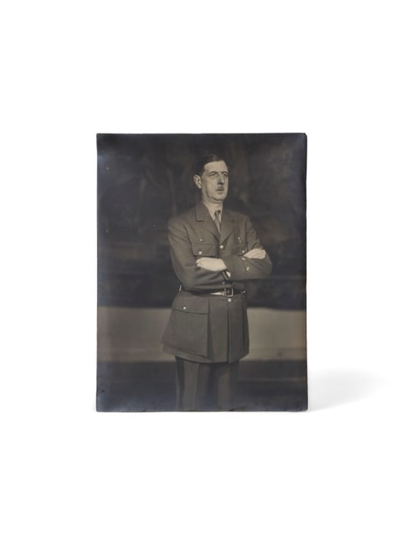 C'est seulement en 2022 que le Studio Harcourt a mis au jour dans ses archives un ensemble de portraits inédits du général de Gaulle, datés de l'immédiat après-guerre. Deux poses solennelles, en uniforme : deux portraits « griffés » Harcourt, l'un montrant de Gaulle en pied, les bras le long du corps, l'autre bras croisés, mais dans un cadrage frontal et serré. L'épreuve que nous présentons diffère de ces versions retenues pour le fonds : non griffée, elle constitue un tirage d'époque rarissime, probablement limité à quelques exemplaires, qui échappèrent à la diffusion officielle. L'exhumation de ces clichés a conduit à des recherches plus approfondies dans les archives Harcourt, permettant d'identifier plus d'une centaine d'autres portraits oubliés : 109 compagnons de la Libération. Ces découvertes ont donné lieu à une exposition récemment organisée (jusqu'en juin 2025) par le Musée de l'Ordre de la Libération, à Hôtel national des Invalide, qui éclaire d'un jour nouveau le rôle de la photographie dans la mémoire visuelle de la Résistance et de la Libération. Au sortir de la guerre, de Gaulle incarne la figure du chef de la France libre, puis du fondateur du Rassemblement du Peuple Français (RPF) en avril 1947. Ces portraits Harcourt participent de la construction d'une iconographie gaullienne où le studio, spécialisé dans les poses héroïques et dramatisées, confère au général une aura de monumentalité. Témoignage rare de cette séance restée longtemps dans l'ombre, qui constitue un jalon important dans l'histoire visuelle du gaullisme et dans le corpus photographique d'après-guerre.