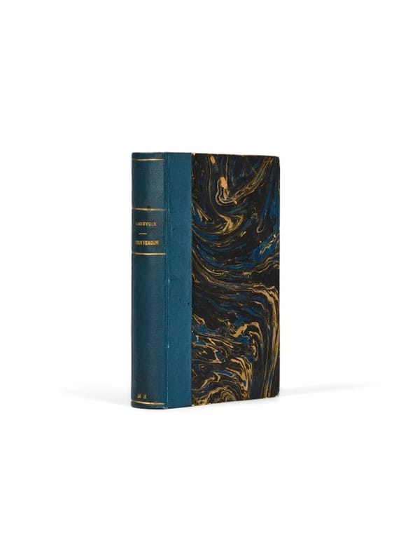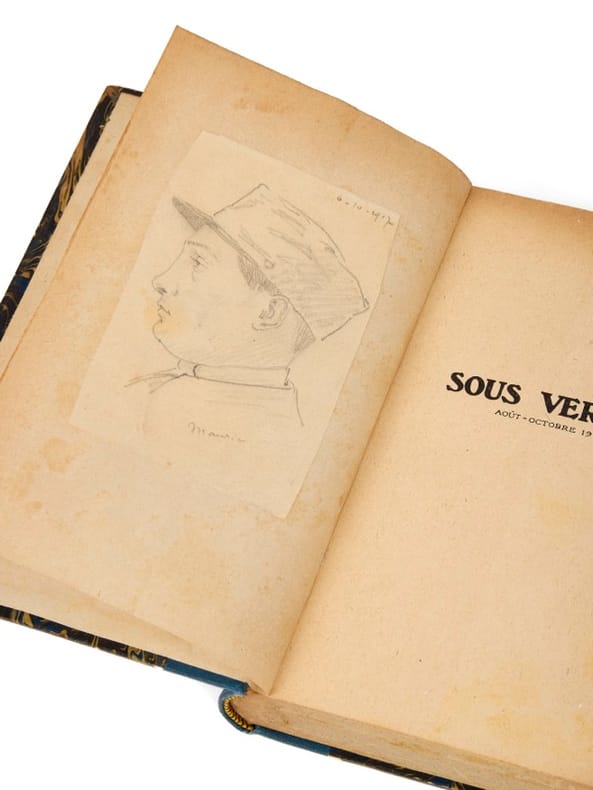 Premier tirage, avec dessin d'un combattant Paris, Librairie Hachette, 1916. 1 vol. (110 x 175 mm) de 269 p. et [1] f. Bradel demi-percaline bleue, titre et filets dorés, chiffre en pied (reliure de l'époque). Édition originale. Préface d'Ernest Lavisse. Exemplaire du premier tirage, que l'on reconnaît au feuillet d'annonce en regard de la page de titre, qui n'indique que le seul titre de Riou déjà paru. Contrecollé en regard du faux-titre, un dessin de trois-quart du visage d'un poilu, daté de 1917, signé «Maurice» (qui n'est pas Genevoix).