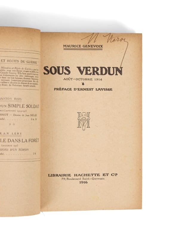 Jeune normalien, Maurice Genevoix intègre en septembre 1914 le 106e régiment d'infanterie et part combattre en Argonne, notamment à la Tranchée de Calonne : il y est grièvement blessé six mois plus tard, le 25 avril 1915 de trois balles, deux au bras et une à la poitrine. Après sept mois de soins, il rentre à Paris, rue d'Ulm et, sous les encouragements du secrétaire général de l'École normale supérieure, Paul Dupuy, avec qui il avait longuement correspondu pendant l'enfer de ces six mois, il accepte de relater son expérience du front et publie Sous Verdun, en avril 1916. Suivront Nuits de guerre, en mai 1917, Au seuil des guitounes, en septembre 1918, La Boue, en février 1921, et enfin Les Éparges, en septembre 1923 : une oeuvre à la fois historique et littéraire, parmi les plus saisissantes jamais produites sur la Grande Guerre. Là où certains pouvaient reprocher aux autres « grandes oeuvres» des écrivains de guerre (Roland Dorgelès avec Les Croix de bois, Henri Barbusse pour Le Feu, Georges Duhamel avec Civilisation, pour ne citer que les principales) des excès de lyrisme ou des récits individuels plus que des expressions collectives, les récits de Genevoix décrivent avec une authenticité rarement égalée la camaraderie des tranchées et surtout l'horreur, la folie, la cruauté de la guerre, et aussi les paradoxes et les choix parfois aberrants du commandement. A tel point que Sous Verdun et La Boue furent amputées par la censure lors de leurs parutions. C'est d'après un journal de route de huit mois (du 25 août 1914 au 25 avril 1915) que Genevoix recomposera ses jours de campagne ; les deux premiers volumes, Sous Verdun et Nuits de guerre, n'omettant aucun jour. « Ces cinq volumes ne sont pas cinq oeuvres différentes ; ils sont à proprement parler les cinq tomes d'une même oeuvre : la transcription et le développement du carnet de l'auteur [même si Genevoix précisera plus tard qu'ils furent aussi composés de mémoire] (...) Parmi les auteurs de la guerre Genevoix occupe le premier rang, sans conteste. Ce n'est point-là une opinion dogmatique, ce n'est pas l'expression d'un goût individuel. (...) Il faut bien le reconnaître, et rira qui voudra, Genevoix a la génie du récit de guerre et son oeuvre est incomparable» : ces mots sont ceux de John Norton Cru, à l'occasion de la présentation qu'il fait de l'auteur dans son ouvrage Témoins, publié en 1929, et qui présente les cinq récits de Genevoix. Pour les rédiger, l'auteur utilise aussi des lettres envoyées à ses proches, à son père, à son frère René, et surtout celles envoyées à Paul Dupuy, rue d'Ulm : « Ce que je devais taire aux miens, écrit-il dans Jeux de glaces (1960), je le confiais librement à ces lettres, avec le souci d'être vrai, de partager sans retenue.» Sous Verdun est salué par la critique : « C'est du Maupassant [à qui l'écrivain consacra un mémoire alors qu'il était à l'École normale supérieure] de derrière les tranchées », s'enthousiasme Le Journal des débats. « On voit la guerre, dans son horreur et sa vérité, toute frémissante. » C'est un succès d'estime pour Genevoix, qui voit son ouvrage flirter avec les 10 000 exemplaires et qui est pressenti pour le Goncourt, avant que la parution du Feu de Barbusse ne viennent, en quelques semaines, changer la donne. En décembre, deux Goncourt sont à décerner : celui pour 1914 (non décerné) et celui pour 1916 : « en deux scrutins, la décision est validée, avec des majorités claires et nettes : le prix Goncourt 1916 est attribué à Barbusse avec huit voix contre deux et celui de 1914 à Adrien Bertrand par neuf voix contre une, celle d'Octave Mirbeau qui offre son suffrage à Genevoix. Comme il fallait bien justifier son vote, il fut hypocritement reproché au normalien d'avoir choisi un titre [Sous Verdun] qui donnait l'impression qu'il allait parler de la grande bataille de 1916, alors que son ouvrage relatait les affrontements survenus en Meuse d'août à octobre 1914. Le favori d'avril s'était fait doubler par une étoile filante et un mourant. » (In Jean-Yves Le Naour, La Gloire et l'Oubli. Maurice Genevoix et Henri Barbusse, témoins de la Grande Guerre, de Michalon, « Histoire », 2020). Bel exemplaire du premier tirage, sans mention d'édition et avec le bon feuillet d'annonce du catalogue en tête.