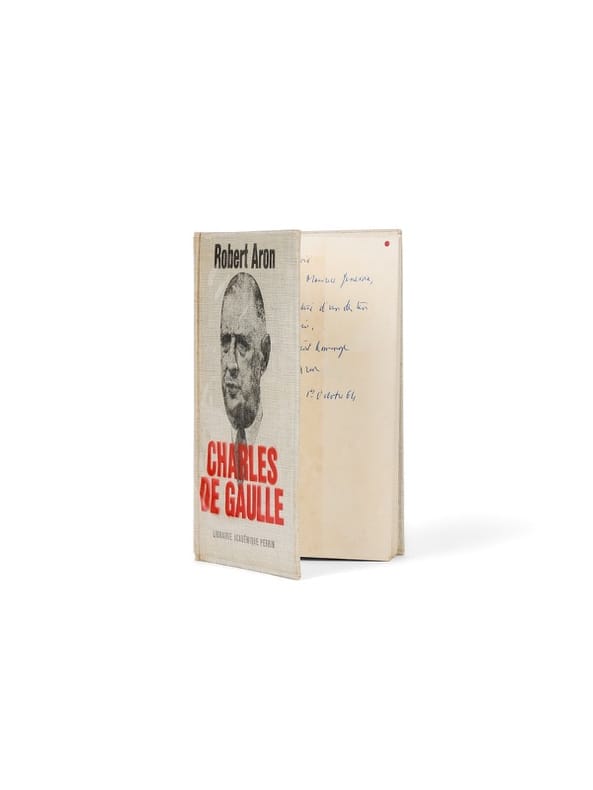 Secrétaire de Gaston Gallimard de 1923 à 1939, Robert Aron gagne l'Algérie en 1940 où il fait partie des premières équipes administratives du général Giraud puis du général de Gaulle. Il se lance à la Libération dans un travail sur l'histoire contemporaine de la France qui lui fera publier de nombreux ouvrages, dont une Histoire de Vichy en 1954. Robert Aron sera élu membre de l'Académie française le 7 mars 1974, le même jour que Maurice Schumann, mais n'y côtoiera Maurice Genevoix et ses confères que quelques mois : il meurt subitement, le 19 avril 1975, cinq jours avant la date prévue pour sa réception solennelle sous la Coupole. On joint : Robert Aron. Nouveaux grands dossiers de l'histoire contemporaine. Paris, Librairie académique Perrin, (15 novembre) 1963. 1 vol. (140 x 215 mm) de 312 p., [2] et 1 f. En feuilles, sous chemise et étui éditeur. Édition originale. Envoi signé : « pour Madame Genevoix et pour Maurice Genevoix, cette évocation des drames dont nous avons été les témoins. En très respectueux hommage, Robert Aron, le 27 janvier 1964. »