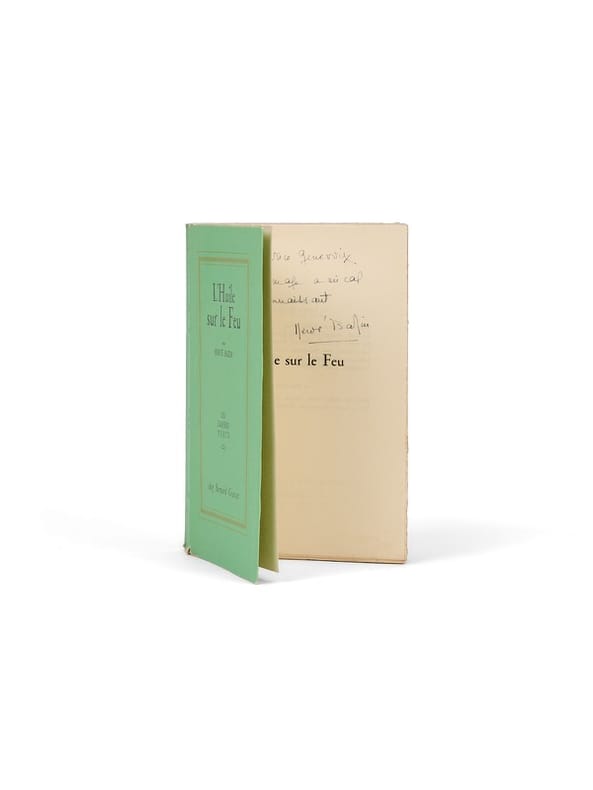 Roman des campagnes angevines et des désastres intimes, L'Huile sur le feu transpose, dans la Saint-Leup du Craonnais, une série d'incendies volontaires qui fissurent la communauté et exacerbent les colères : le capitaine des pompiers Bernard «Tête-de-drap» Colu, mutilé de guerre, lutte autant contre le feu que contre la vindicte villageoise, tandis que Céline, sa fille et narratrice de seize ans, perd peu à peu l'innocence au contact des rancoeurs adultes. En arrière-plan, le couple parental à l'agonie - mère humiliatrice et père meurtri qui refuse la séparation - donne au livre sa teneur de roman de moeurs et son thème de prédilection chez Bazin, la famille (Hervé Bazin fut père de sept enfants) : arbitrages impossibles, honte sociale du divorce au début des années 1950, fatalité d'un ordre rural et de celui d'un village où (hormis le curé), l'environnement social reposait essentiellement sur quatre membres indissolubles : le châtelain, le notaire, le vétérinaire et le médecin. Ancré près d'Angers - Bazin y est né -, le récit offre une proximité ligérienne éclairante avec l'univers de Maurice Genevoix à qui cet exemplaire est offert. Ce dernier , consacrera à Bazin un dossier portrait deux ans plus tard dans le revue « Livres de France », puis « Biblio » la même année, où il commente sa « personnalité forte et réfractaire aux compromis ». De la bibliothèque Maurice Genevoix (envoi et ex-libris).