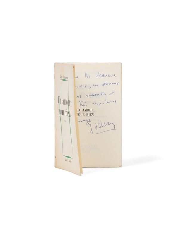 Après L'Amour est un plaisir (1956), Jean d'Ormesson publie à 35 ans ce deuxième roman, qui prolonge une même veine d'élégance désinvolte et de mélancolie amoureuse : « [...] c'est l'histoire d'un amour qui aurait pu être heureux. Je ne sais si je la raconte pour la revivre ou pour l'oublier. Je sens seulement en moi le goût amer et tendre des larmes du souvenir. » Publié chez René Julliard, l'éditeur de nombreux jeunes talents littéraires des années 1950-1960, Un amour pour rien fut remarqué par la critique pour son écriture brillante et, bien avant la reconnaissance institutionnelle, marque une étape dans l'émergence d'un romancier qui se veut déjà en marge des grandes écoles du roman psychologique ou engagé. C'est tout d'abord avec l'oncle de Jean d'Ormesson, Wladimir d'Ormesson, écrivain et diplomate, membre de l'Académie française de 1956 à 1973, que Maurice Genevoix noua une belle amitié. Le neveu, Jean d'Ormesson, prendra la suite, en rentre à l'Académie française en 1973. Il aura pour Maurice Genevoix une immense et affectueuse admiration, tant pour l'écrivain que pour l'homme ; au lendemain de la mort de ce dernier, en septembre 1980, il lui rendait hommage en redisant, avec émotion, le bonheur de l'avoir connu : « Il savait ce qu'il valait : il n'était pas orgueilleux. Il pouvait être vif, incisif, il n'était jamais méchant. Il avait de la tendresse pour les forêts, les animaux, sa Loire natale, sa Sologne, pour ceux qui souffrent et qui meurent ; les hommes l'aimaient en retour. Il savait tout : il était le contraire d'un pédant. Il comprenait tout. Mais il savait vivre. Tous les honneurs étaient passés sur lui sans l'atteindre. Cet homme des bois et ce guerrier était un intellectuel. Il avait à porter témoignage sur tout ce qu'une génération de Français a connu de malheurs et de joies : la vie simple et heureuse, l'amour de la terre, la guerre et la paix, le souvenir. » Bel exemplaire qui témoigne de l'attention portée par le jeune romancier à son aîné. L'envoi, strictement contemporain de la parution du roman, donne les prémisses d'une relation qui n'ira que croissante en qualité et en amitié.