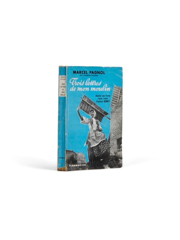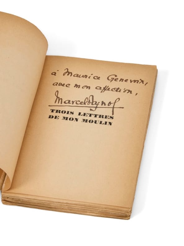 C'est en 1954 que Marcel Pagnol réalise Les Lettres de mon moulin, un film à sketches qui adapte Les Trois Messes basses, L'Élixir du révérend père Gaucher et Le Secret de maître Cornille, trois des nouvelles du maître-livre d'Alphonse Daudet, accompagnés d'un « Prologue ». En 1967, il complètera ces adaptations avec un téléfilm tiré du Curé de Cucugnan. On ne cite pas souvent ces « nouvelles Lettres de mon moulin » au titre des chefs-d'oeuvre de Pagnol. On a certainement tort : c'est une magnifique introduction aux oeuvres des deux auteurs et une belle leçon de littérature par l'hommage de Pagnol à l'un des ses maîtres, sur le fond et sur la forme. Intéressante provenance, mariant deux écrivains que l'amour du terroir et de l'enfance rapprochait. Pagnol précéda son aîné à l'Académie française de quelques mois, puisqu'il avait été immortalisé, à quarante-sept ans seulement, le 4 avril 1946. Sa réception, le 27 mars 1947, par Jérôme Tharaud, est filmée, ce qui constituait une première dans l'histoire de l'Académie française. Genevoix, sera quant à lui élu en octobre 1946, et le reçu six mois après Pagnol, le 13 novembre 1947. Leur élection presque conjointe à l'Académie française met en lumière leur statut comme figures littéraires respectées et leur influence sur la culture française, renforçant le lien entre les deux auteurs et soulignant leur importance dans la vie littéraire d'après-guerre. Quelques accrocs et plis à la couverture.
