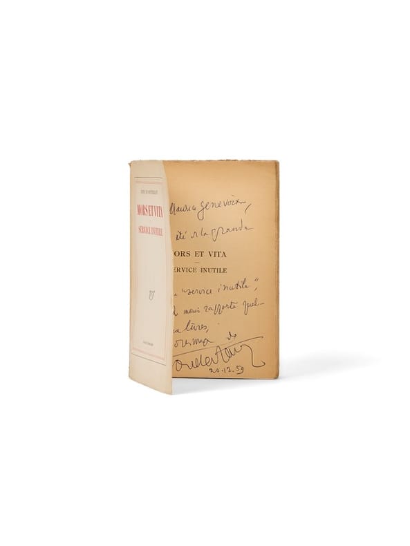 Bel envoi à Maurice Genevoix Paris, Gallimard, (19 mai) 1954. 1 vol. (140 x 210 mm) de 360 p., [1] et 1 f. Broché. Édition originale. Un des exemplaires poinçonnés du service de presse. Envoi signé : «À M. Maurice Genevoix, qui a été de la grande équipe du “service inutile”, et en a le moins rapporté quelques beaux livres, hommages d'Henry de Montherlant, 20.12.59».