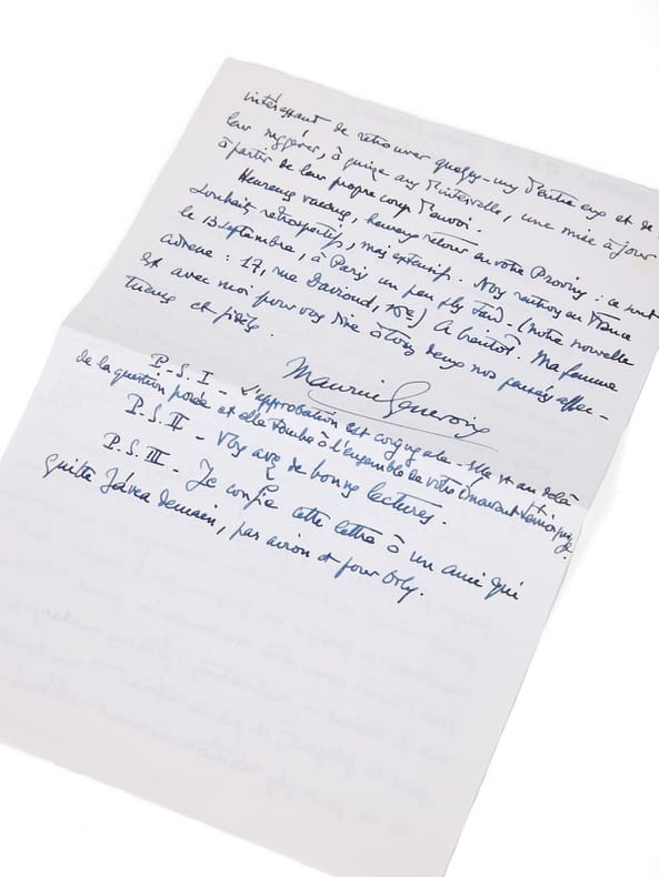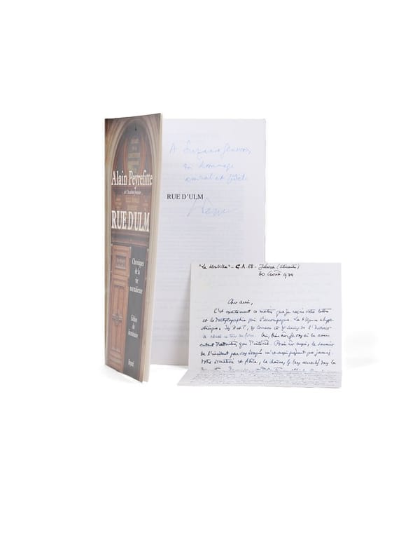 Conservée dans l'exemplaire : intéressante lettre autographe signée de Maurice Genevoix (2 p. en 1 f.), datée d'Alicante, le 30 août 1974 (probablement Peyrefitte, lors de la réédition de son texte, l'a t-il offerte en retour à Suzanne Genevoix avec cet exemplaire) : elle répond à la dactylographie originale de ce Rue d'Ulm que Peyrefitte avait adressée en 1974 à l'ancien de l'École normale qui l'a «lu avec autant d'attention que d'intérêt [...]Bien sûr aussi, le souvenir de l'incident par vous évoqué m'est aussi présent que jamais. [...] la chaîne, les bras croisés dans le dos etc...[...]Tout à fait d'accord avec votre commentaire quant à leurs - comme ils disaient - motivations. Schémas mentaux, en effet, pour la plupart, et qui se réfèrent à une tradition on ne peut plus réactionnairement sclérosée...» De la bibliothèque de Maurice Genevoix, aux « Vernelles » (ex-libris).