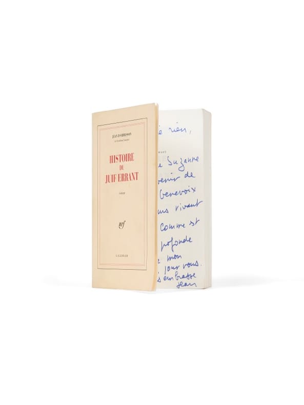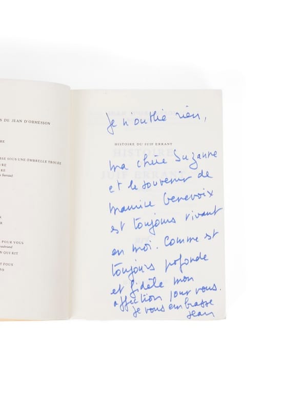 Dans ce roman foisonnant, Jean d'Ormesson déploie son érudition et sa verve en parcourt la figure mythique du Juif errant. Des Vikings à Christophe Colomb, du calvaire du Christ à la Venise contemporaine, il fait traverser les siècles à un personnage condamné à l'immortalité pour avoir refusé de donner un verre d'eau au supplicié du Golgotha : un conte philosophique où l'académicien manie humour et élégance pour rendre hommage aux grands mythes fondateurs. Provenance : Suzanne Genevoix (1912-1997), qui épousa Maurice Genevoix en 1943, conserva la vaste bibliothèque de l'écrivain, y ajoutant à la suite de nombreux volumes dédicacés par les pairs et amis de son mari à l'Académie française, avec lesquels elle avait forgé de nombreux liens.