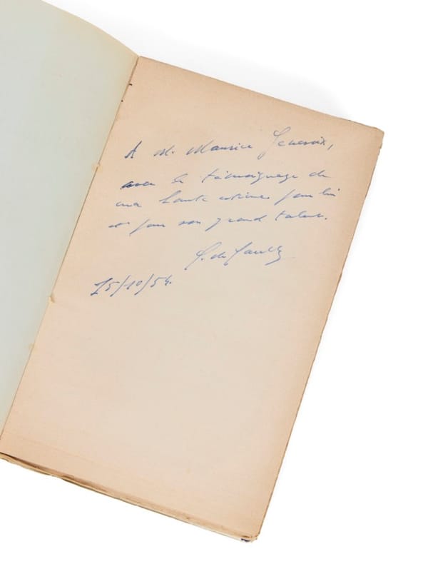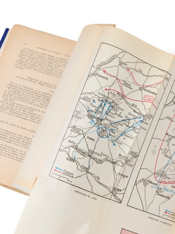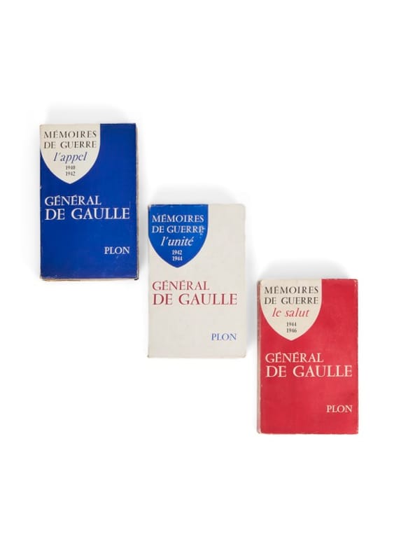Les Mémoires de guerre : exemplaire Maurice Genevoix Paris, Plon, 1954, 1956 et 1959. 3 vol. (145 x 230 mm) de 680, 712 et 653 p. + 1 carte. Brochés, sous jaquettes tricolores. Édition originale. Un des exemplaires numérotés sur Alfa Cellunaf, réservés « aux anciens de la France Libre et aux membres des associations combattantes et résistantes de la guerre 1939-1945 ». Envoi signé : « à Maurice Genevoix, en témoignage de ma haute estime pour lui et pour son grand talent. Charles de Gaulle, 15 octobre 1954 ».