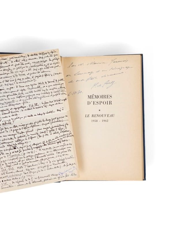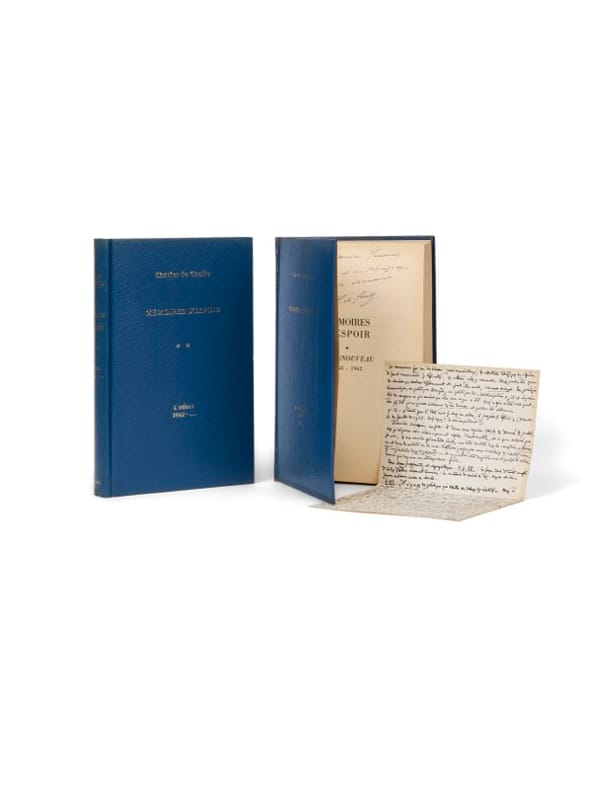 L'ultime parution de de Gaulle : exemplaire Maurice Genevoix avec envoi Paris, Plon, (30 août) 1970 et (6 février) 1971. 2 vol. (135 x 210 mm) de 314 p. et 223 p. Cartonnage bleu de l'éditeur. Édition originale. Envoi signé: «Pour M. Maurice Genevoix, en hommage et en témoignage de mon fidèle dévouement. C. de Gaulle, 6.10.70.» Exemplaire accompagné d'une longue note de lecture de Genevoix à propos de ce texte, 1 p. 1/2 en 1 f. (148 x 210 mm) à en-tête de l'Académie.