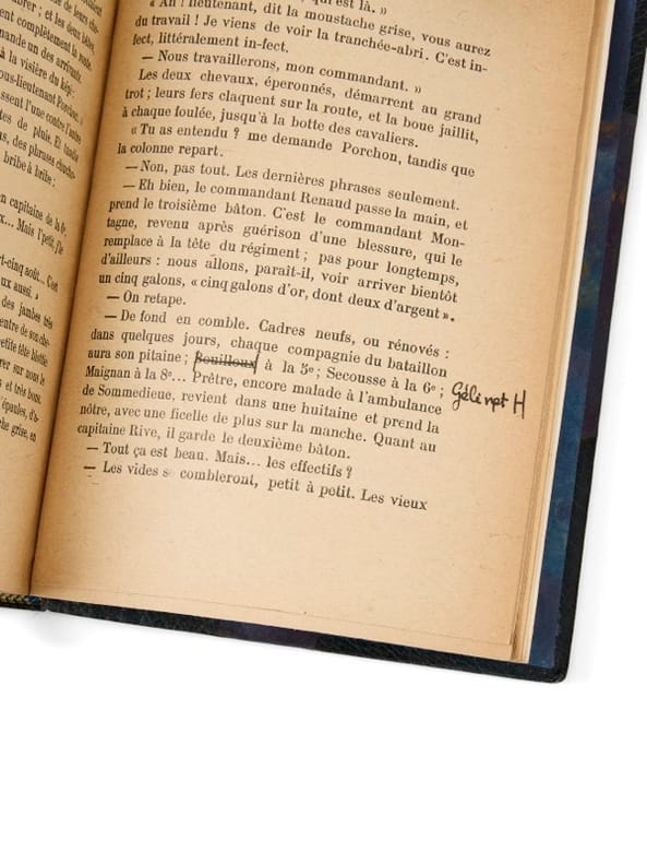 Troisième des récits de guerre de Genevoix, Au seuil des guitounes (le terme de « guitoune », d'origine nord-africaine, est utilisé dans l'argot militaire pour désigner une tente) couvre la période du 20 octobre au 3 novembre 1914, racontée en quinze jours. Il constitue la suite directe de Sous Verdun et de Nuits de guerre, et en partage les contraintes : le récit, contemporain des faits, ne peut se soustraire à la censure militaire. Ici encore, un passage entier est supprimé, p. 119. L’auteur conservera ce précieux exemplaire de l’édition originale, abondamment corrigé de sa main. Il comprend plus d’une centaine de modifications autographes : la plupart sont typographiques, mais plusieurs touchent au vocabulaire, à la syntaxe, à l’équilibre des phrases, ou à l’identité des personnages – les noms laissés en blanc dans l’édition sont ici parfois explicités. Genevoix restaure surtout le passage censuré. Il s’agit d’un dialogue particulièrement critique vis-à-vis du commandement militaire, tenu par l’ordonnance Pannechon – figure semi-comique mais lucide –, supprimé dans l’édition de 1918 : « D'abord, mon lieutenant, ceux qui nous ont défendu d'tirer, est-ce qu'is sont v'nus s'rendre compte sur place ? Pensez-vous ! C'est toujours pareil ! Ceux qui savent pas, c'est juste ceux-là qui commandent. » Et le narrateur d’enchaîner : « Toujours pareil en effet. Toujours le même dogmatisme raide, la même fate confiance en soi, le même refus de se soumettre aux faits. » Genevoix a soigneusement recopié ce passage à la plume dans l’espace laissé vierge, où ne figurait plus que la mention (Censuré). Cette annotation restauratrice, ajoutée aux nombreuses corrections du texte, fait de cet exemplaire un véritable document de travail, préparatoire à la réédition complète et non expurgée qu’il donnera en 1926. Un des plus beaux exemplaires connus de ce récit, à la fois exemplaire de l’écrivain, manuscrit de reconstitution, et archive vivante de la censure en temps de guerre ; il est conservé dans une demi-reliure de maroquin bleu à coins, établie à l’identique de ses autres exemplaires personnels De la bibliothèque de Maurice Genevoix, aux « Vernelles », avec ex-libris.